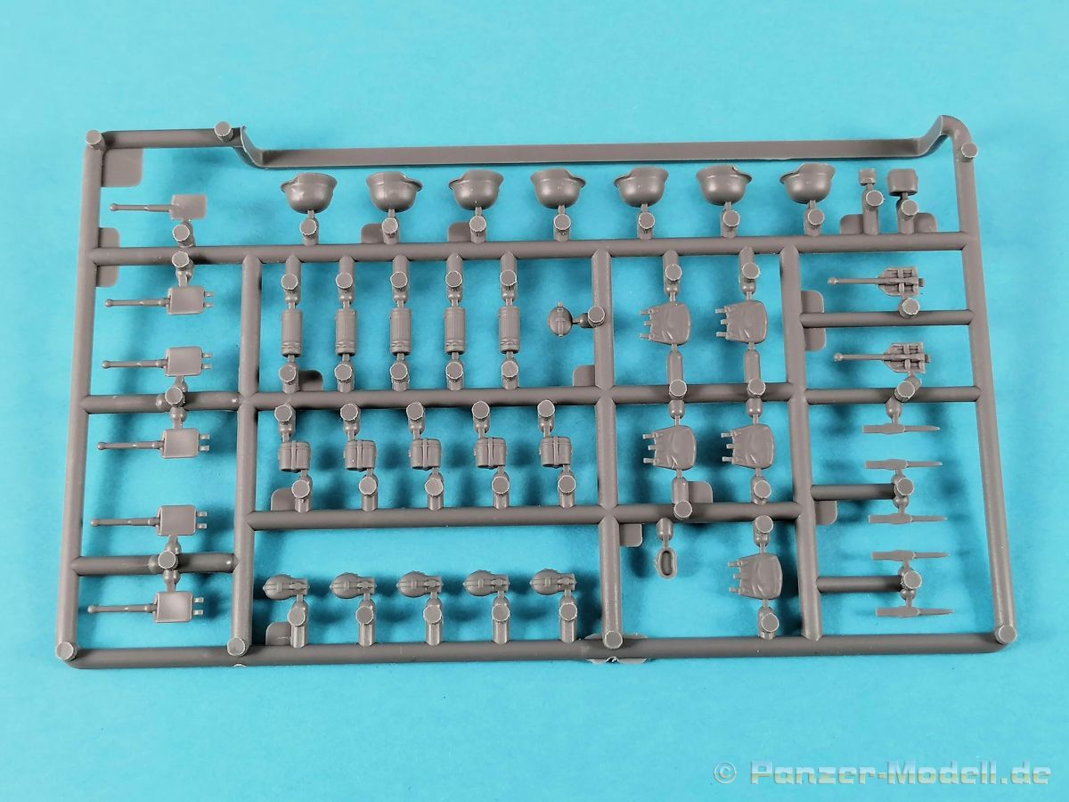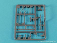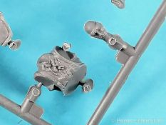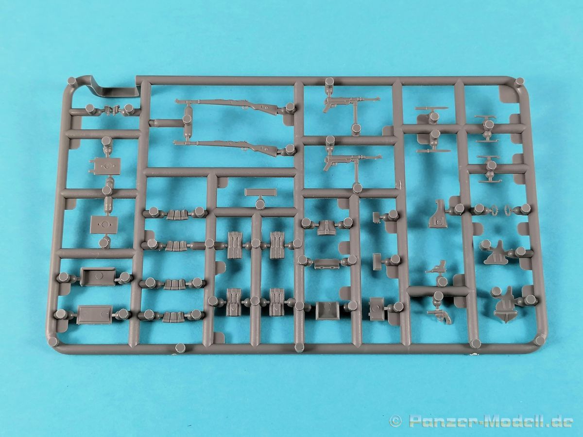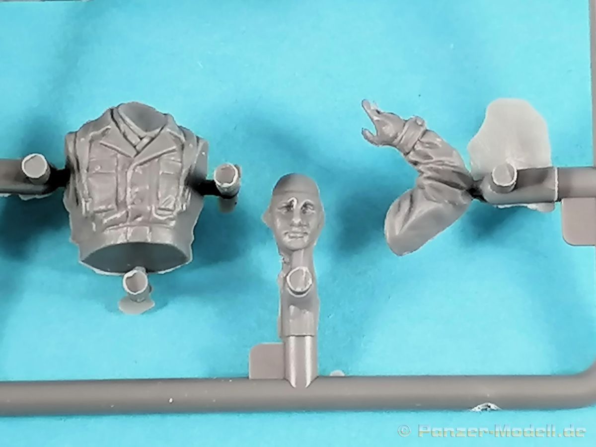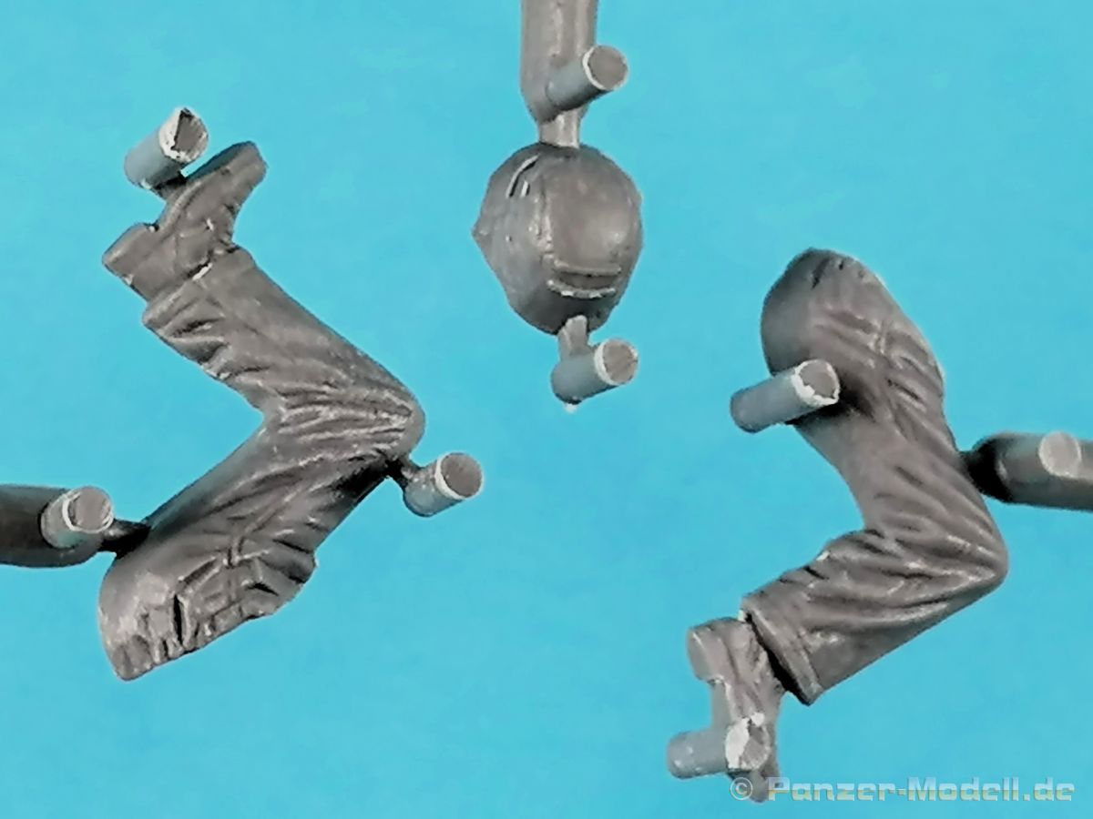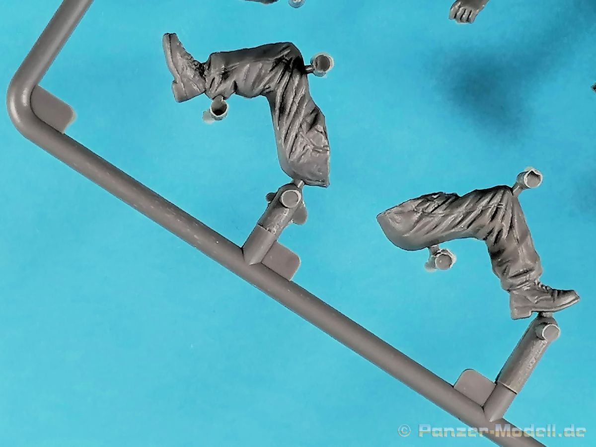 Aus vier, zB. auf einem Panzer aufgesessene Soldaten mit Tarnuniformen der Waffen-SS, die im späteren Verlauf des Krieges anzutreffen waren besteht das erste Set. In der 260x160x35 mm großen Schüttbox befinden sich vier hellgraue Rahmen für die Figuren und drei für Ausrüstung und Waffen. Dazu kommt noch ein kleiner Steg der vier Köpfe aus Resin enthält. Auf der Rückseite der Schachtel sehen wir farbige Abbildungen der Figuren. Teilenummern und Markierungen zeigen, wo die Teile hingehören. Bemalungshinweise und eine Farbtabelle für Vallejo, Mr. Color, AK RC, Mission Models, AMMO MIG und Tamiya Farben befindet unterhalb der Anleitung. Die Teile aus grauem Plastik sind gut ausgeformt und weisen keinen Verzug, Versatz oder Sinkstellen auf. Die Angüsse fallen akzeptabel aus und sind so gesetzt, dass sie beim Abtrennen vom Spritzling und beim Versäubern keine Probleme bereiten. Feiner Grat der Formtrennnaht ist zu finden, aber mit Bastelmesser, einer feinen Feile oder Schleifpapier lässt sich diese leicht entfernen. Jede Figur besteht aus Rumpf, Armen, Beinen, Kopf und Helm mit Tarnüberzug. Bei Figuren, die ihre Waffen direkt in den Händen tragen, sind separate Fingergruppen dabei, mit denen man die Waffen glaubhafter an die Hände kleben kann. Bei der Figur, bei denen die Schuhsohlen sichtbar sind, sind diese separat vorhanden und als genagelte Sohlen zu erkennen. Auch wenn die Helme aufgesetzt werden, sind sie dennoch mit dem gut gestalteten Innenfutter versehen. Details wie Hosennähte und Gamaschen können ebenfalls punkten. Der Faltenwurf der Uniformen ist weicher als bei Resinfiguren, kommt aber glaubhaft daher. Auch die Gesichter sind für Spritzguss gut ausgeführt. Als Alternative liegen für die Köpfe/Gesichter solche aus Resin bei. Sehr löblich! Auf drei weiteren Spritzlingen finden sich Waffen (Karabiner, Maschinenpistolen, Pistolen, Munitionstaschen) und Ausrüstungteile (Helme, Brotbeutel, Klappspaten, Kochgeschirr, Gasmaskenbüchsen, Feldflaschen, Bajonette). Die Detaillierung ist als sehr gut zu bezeichnen. Man findet u.a. auch eine offene, leere Pistolentasche, offenes Kochgeschirr und separate, mehrteilige Klappschulterstützen für die MP40. Am besten orientiert man sich am Kartonbild und der Bau-/Bemalungsanleitung, was davon benötigt wird. Nicht jede Waffe wird direkt zu den Figuren passen, aber man hat dann noch jede Menge für die Ersatzteilkiste Die Halterungen und Titel suggerieren, dass die Figuren aufgesessen auf einem Panzer mitfahren, aber man kann sie sicherlich auch anderweitig verwenden wie sitzend auf den Stufen einer Treppe, auf einem Baumstamm im Gelände oder auf der Pritsche eines Lkws. Möglichkeiten gibt es genug. Definitiv ein Figurensatz der sich lohnt.