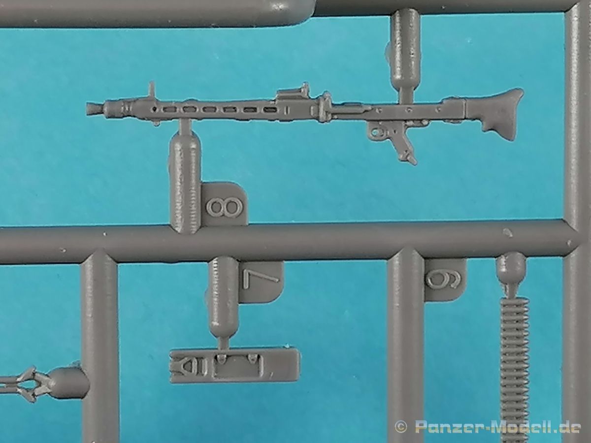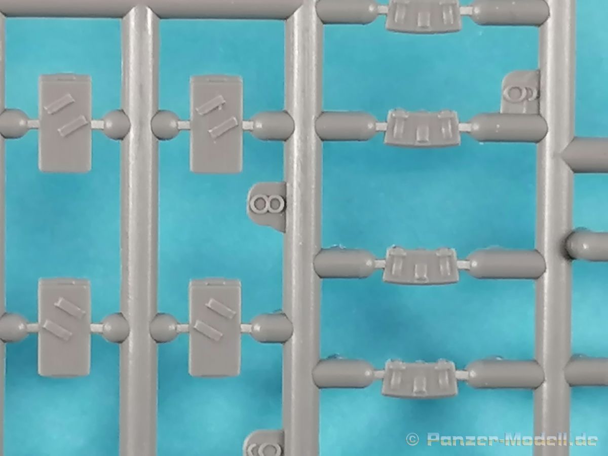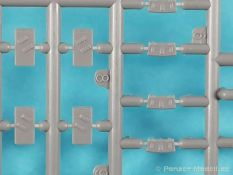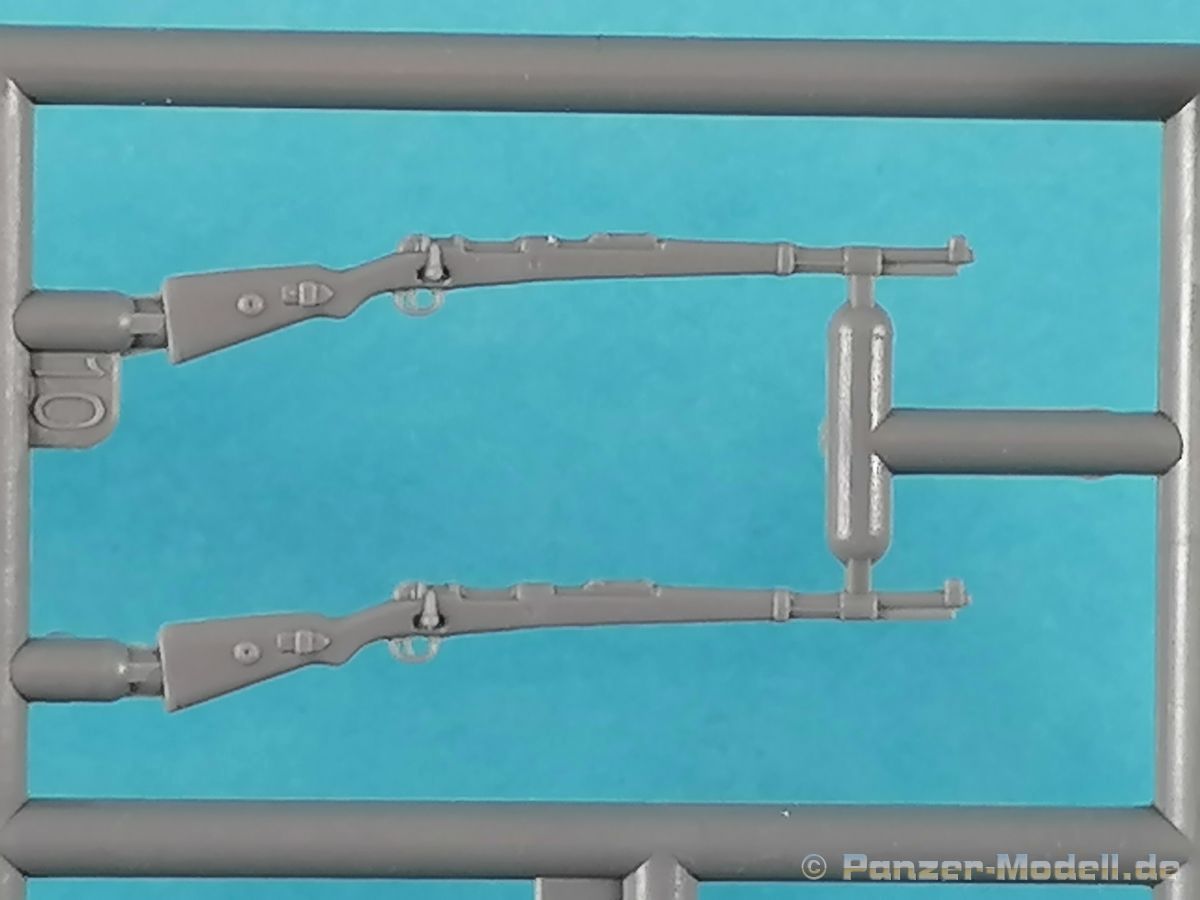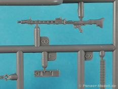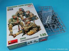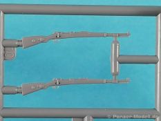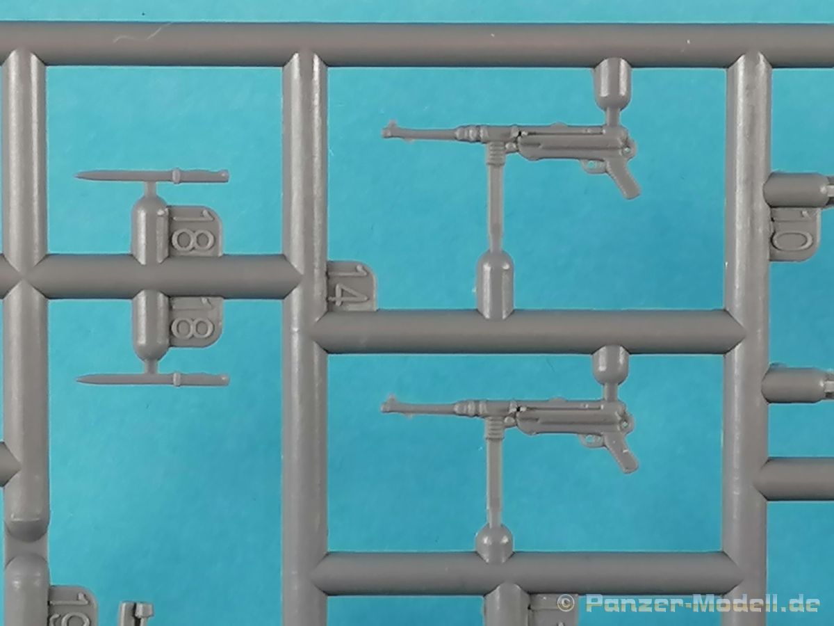 Aus vier, zB. auf einem Panzer aufgesessene Soldaten mit Tarnuniformen der Waffen-SS, die im späteren Verlauf des Krieges anzutreffen waren besteht das erste Set. In der 260x160x35 mm großen Schüttbox befinden sich vier hellgraue Rahmen für die Figuren und drei für Ausrüstung und Waffen. Dazu kommt noch ein kleiner Steg der vier Köpfe aus Resin enthält. Auf der Rückseite der Schachtel sehen wir farbige Abbildungen der Figuren. Teilenummern und Markierungen zeigen, wo die Teile hingehören. Bemalungshinweise und eine Farbtabelle für Vallejo, Mr. Color, AK RC, Mission Models, AMMO MIG und Tamiya Farben befindet unterhalb der Anleitung. Die Teile aus grauem Plastik sind gut ausgeformt und weisen keinen Verzug, Versatz oder Sinkstellen auf. Die Angüsse fallen akzeptabel aus und sind so gesetzt, dass sie beim Abtrennen vom Spritzling und beim Versäubern keine Probleme bereiten. Feiner Grat der Formtrennnaht ist zu finden, aber mit Bastelmesser, einer feinen Feile oder Schleifpapier lässt sich diese leicht entfernen. Jede Figur besteht aus Rumpf, Armen, Beinen, Kopf und Helm mit Tarnüberzug. Bei Figuren, die ihre Waffen direkt in den Händen tragen, sind separate Fingergruppen dabei, mit denen man die Waffen glaubhafter an die Hände kleben kann. Bei der Figur, bei denen die Schuhsohlen sichtbar sind, sind diese separat vorhanden und als genagelte Sohlen zu erkennen. Auch wenn die Helme aufgesetzt werden, sind sie dennoch mit dem gut gestalteten Innenfutter versehen. Details wie Hosennähte und Gamaschen können ebenfalls punkten. Der Faltenwurf der Uniformen ist weicher als bei Resinfiguren, kommt aber glaubhaft daher. Auch die Gesichter sind für Spritzguss gut ausgeführt. Als Alternative liegen für die Köpfe/Gesichter solche aus Resin bei. Sehr löblich! Auf drei weiteren Spritzlingen finden sich Waffen (Karabiner, Maschinenpistolen, Pistolen, Munitionstaschen) und Ausrüstungteile (Helme, Brotbeutel, Klappspaten, Kochgeschirr, Gasmaskenbüchsen, Feldflaschen, Bajonette). Die Detaillierung ist als sehr gut zu bezeichnen. Man findet u.a. auch eine offene, leere Pistolentasche, offenes Kochgeschirr und separate, mehrteilige Klappschulterstützen für die MP40. Am besten orientiert man sich am Kartonbild und der Bau-/Bemalungsanleitung, was davon benötigt wird. Nicht jede Waffe wird direkt zu den Figuren passen, aber man hat dann noch jede Menge für die Ersatzteilkiste Die Halterungen und Titel suggerieren, dass die Figuren aufgesessen auf einem Panzer mitfahren, aber man kann sie sicherlich auch anderweitig verwenden wie sitzend auf den Stufen einer Treppe, auf einem Baumstamm im Gelände oder auf der Pritsche eines Lkws. Möglichkeiten gibt es genug. Definitiv ein Figurensatz der sich lohnt.