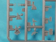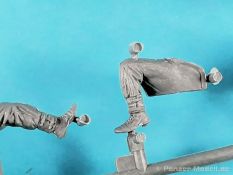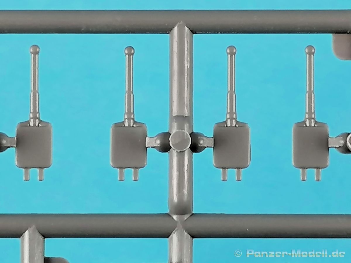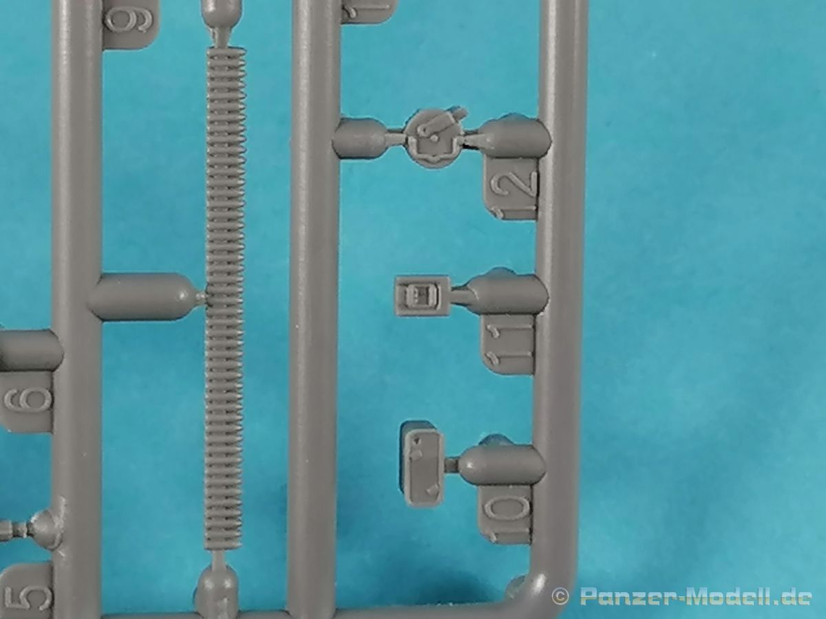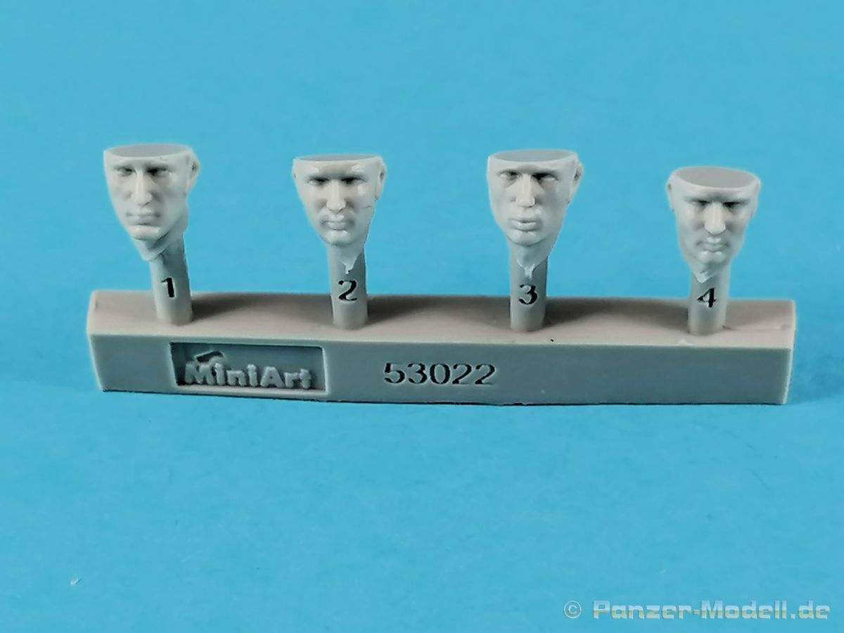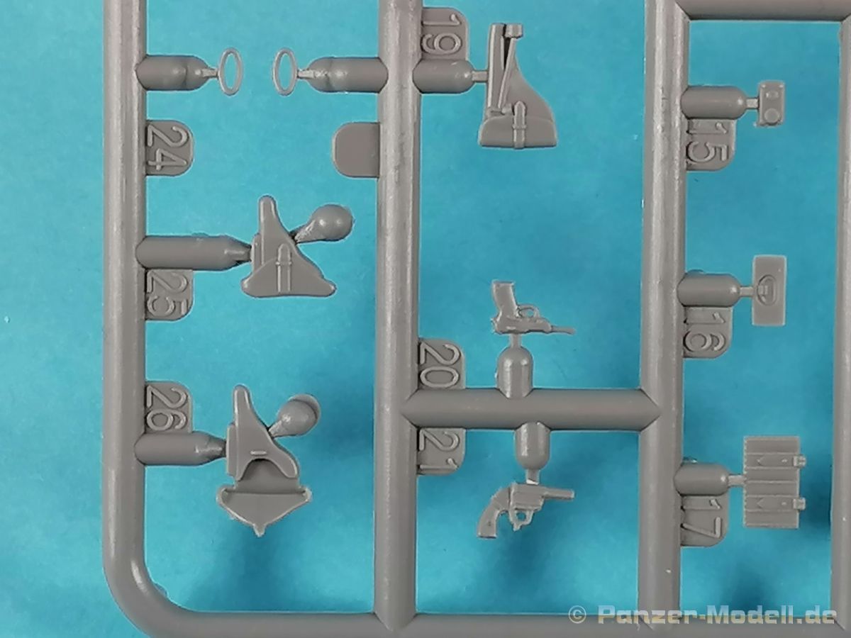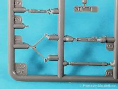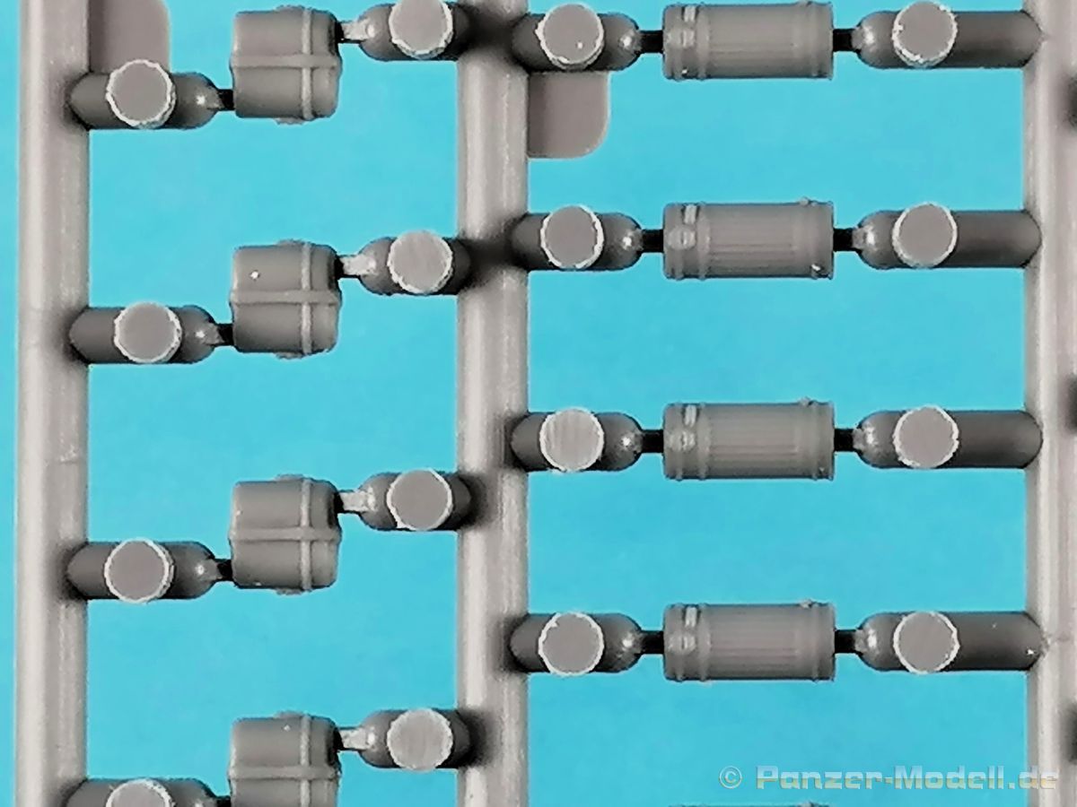 Aus vier, zB. auf einem Panzer aufgesessene Soldaten mit Tarnuniformen der Waffen-SS, die im späteren Verlauf des Krieges anzutreffen waren besteht das erste Set. In der 260x160x35 mm großen Schüttbox befinden sich vier hellgraue Rahmen für die Figuren und drei für Ausrüstung und Waffen. Dazu kommt noch ein kleiner Steg der vier Köpfe aus Resin enthält. Auf der Rückseite der Schachtel sehen wir farbige Abbildungen der Figuren. Teilenummern und Markierungen zeigen, wo die Teile hingehören. Bemalungshinweise und eine Farbtabelle für Vallejo, Mr. Color, AK RC, Mission Models, AMMO MIG und Tamiya Farben befindet unterhalb der Anleitung. Die Teile aus grauem Plastik sind gut ausgeformt und weisen keinen Verzug, Versatz oder Sinkstellen auf. Die Angüsse fallen akzeptabel aus und sind so gesetzt, dass sie beim Abtrennen vom Spritzling und beim Versäubern keine Probleme bereiten. Feiner Grat der Formtrennnaht ist zu finden, aber mit Bastelmesser, einer feinen Feile oder Schleifpapier lässt sich diese leicht entfernen. Jede Figur besteht aus Rumpf, Armen, Beinen, Kopf und Helm mit Tarnüberzug. Bei Figuren, die ihre Waffen direkt in den Händen tragen, sind separate Fingergruppen dabei, mit denen man die Waffen glaubhafter an die Hände kleben kann. Bei der Figur, bei denen die Schuhsohlen sichtbar sind, sind diese separat vorhanden und als genagelte Sohlen zu erkennen. Auch wenn die Helme aufgesetzt werden, sind sie dennoch mit dem gut gestalteten Innenfutter versehen. Details wie Hosennähte und Gamaschen können ebenfalls punkten. Der Faltenwurf der Uniformen ist weicher als bei Resinfiguren, kommt aber glaubhaft daher. Auch die Gesichter sind für Spritzguss gut ausgeführt. Als Alternative liegen für die Köpfe/Gesichter solche aus Resin bei. Sehr löblich! Auf drei weiteren Spritzlingen finden sich Waffen (Karabiner, Maschinenpistolen, Pistolen, Munitionstaschen) und Ausrüstungteile (Helme, Brotbeutel, Klappspaten, Kochgeschirr, Gasmaskenbüchsen, Feldflaschen, Bajonette). Die Detaillierung ist als sehr gut zu bezeichnen. Man findet u.a. auch eine offene, leere Pistolentasche, offenes Kochgeschirr und separate, mehrteilige Klappschulterstützen für die MP40. Am besten orientiert man sich am Kartonbild und der Bau-/Bemalungsanleitung, was davon benötigt wird. Nicht jede Waffe wird direkt zu den Figuren passen, aber man hat dann noch jede Menge für die Ersatzteilkiste Die Halterungen und Titel suggerieren, dass die Figuren aufgesessen auf einem Panzer mitfahren, aber man kann sie sicherlich auch anderweitig verwenden wie sitzend auf den Stufen einer Treppe, auf einem Baumstamm im Gelände oder auf der Pritsche eines Lkws. Möglichkeiten gibt es genug. Definitiv ein Figurensatz der sich lohnt.