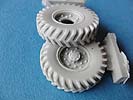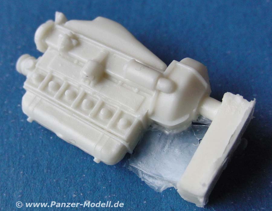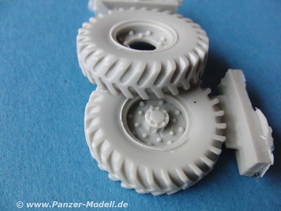 Die Resinteile sind dann für die kleinen und feinen Details des Modells. Diese umfassen etwas größere teile wie die Räder und der Motor über Armaturen bis hin zu Polsterungen und Stellhebeln. Der Guss ist 1A mit angenehm kleinen Angüssen. Die Details sind ebenfalls sehr gut dargestellt, scharf abgegrenzt und teilweise erstaunlich fein. Auch das auffällige Profil der Reifen ist sahnemäßig gegossen.