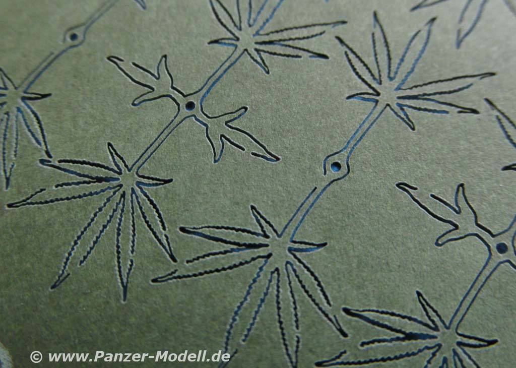 Genau so etwas machen die Jungs von modelscene und mit dem vorliegenden Set in dem sich 4 lasergeschnittene Papiere (8 x 6,5cm) befinden kann der geneigte Modellbauer Cannabispflanzen für das heimische Diorama bauen. Die einzelnen Teile wie Blätter und Stengel sind sauber und fein aus entsprechend farbigem Papier geschnitten und hängen nur noch an dünnen Ansätzen im Blatt, sodass sie schnell herausgetrennt sind.