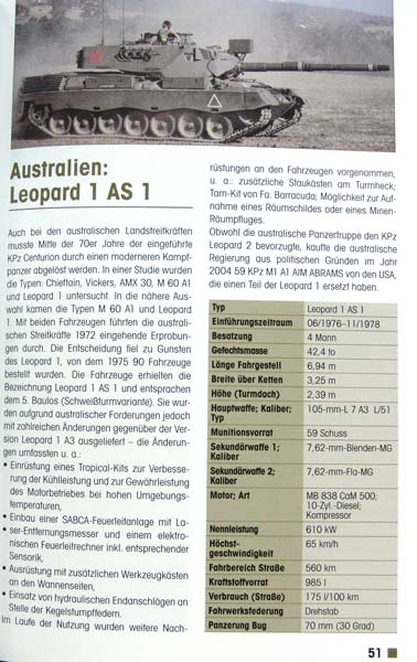 Doch damit nicht genug - es folgen ebenso übersichtlich und mit Foto, Texten und Tabellen die ganzen Versionen der Leopard 1, die im Ausland im Einsatz waren und sind. Darunter Belgien, Niederlande, Norwegen, Italien, Dänemark, Türkei udn Australien.