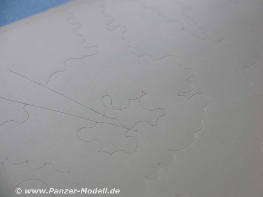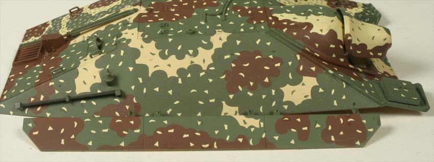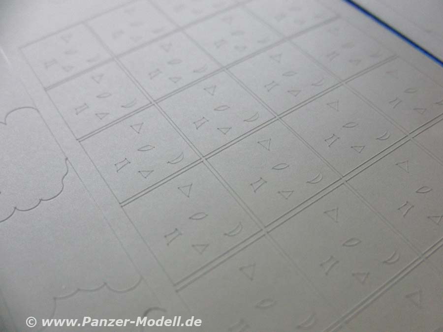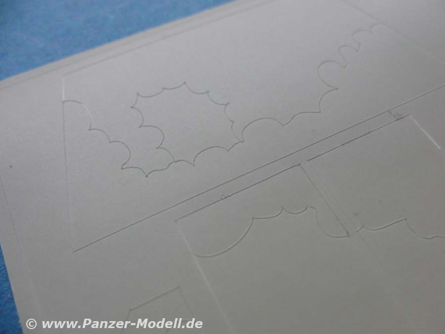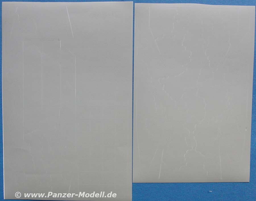 Die Folie ist exakt auf die einzelnen Bereiche des Hetzers zugeschnitten und die einzelnen Tarnflecken eingeschnitten, sodass sich die einzelnen Tarnflecken einzeln entnehmen und auf das Modell bringen lassen.