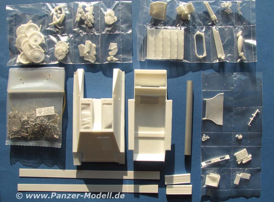 Der Bausatz ist ein Komplettbausatz, d.h. es wird kein Basisbausatz benötigt. Im Bausatz enthalten sind etwa 70 Resinteile, eine Metallrohr und ein Satz Friulmodel Ketten.