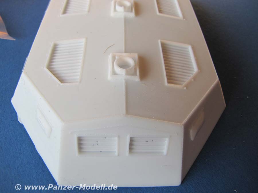 Die Angüsse sind werksseitig bereits auf ein Mindestmaß reduziert, was das Basteltempo und den Spaßfaktor erhöht. Sogar die Unterwanne hat den Anguss an der Front und ist bereits versäubert und nicht wie zuvor über die ganze Bodenplatte. Die Unterwanne ist sehr dünn und filigran gearbeitet und bietet eine umfangreiche Inneneinrichtung mit Fahrerplatz, den zwei Dampfkesseln und den entsprechenden Dampf und Wasserleitungen mit Antriebselementen. Die Wanne an sich ist eine verlängerte 38D Wanne mit insgesamt 6 Laufrollen pro Seite.