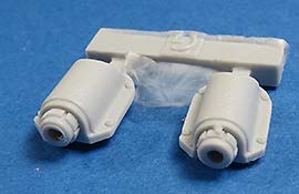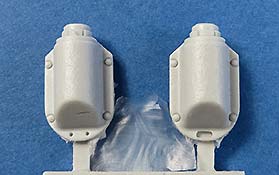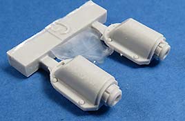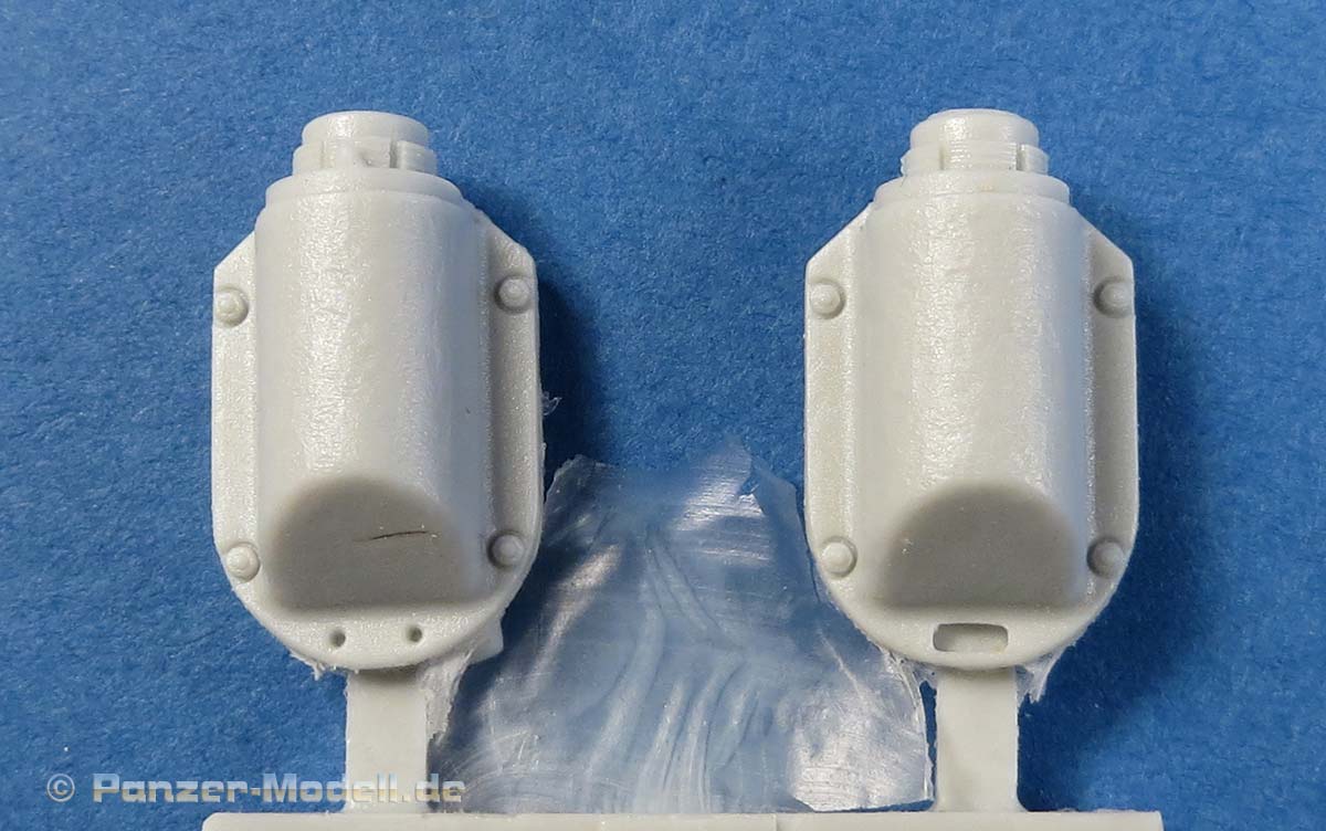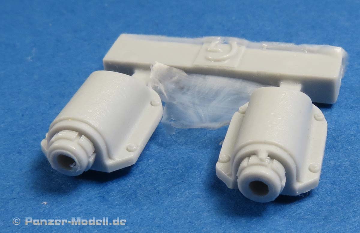 Die beiden Stücke stellen die gegossenen Schutzblöcke an der Basis der beiden Auspufftöpfe dar, die bei Panther G zum Einsatz kamen und die Plastikteile in vorhandenen Bausätzen ersetzt.