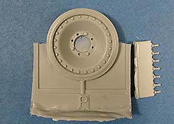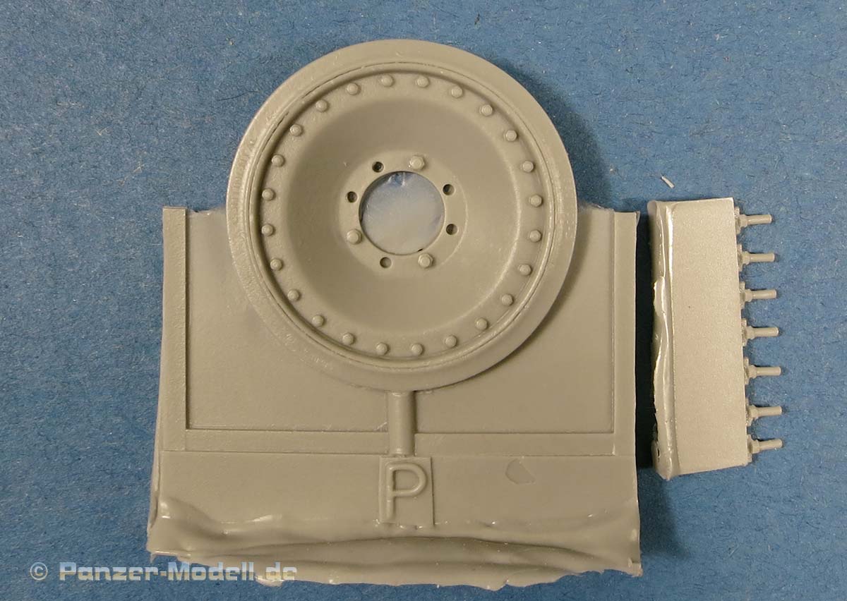 In der Blisterverpackung finden wir 8 Resinteile, die fein und sauber gegossen sind ohne Gießfehler sind und dazu sehr filigran mit der Darstellung der sehr kleinen und feinen Halterungen. Die Angüsse dieser Resinteile ist an der Basis und damit seh klein. Das Ersatzrad des Panthers ist zur Hälfte an der Lauffläche mit Anguss versehen, d.h. es ist etwas mehr Versäuberung vonnöten..
