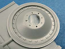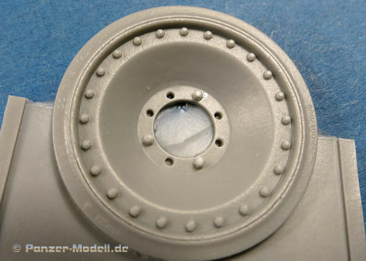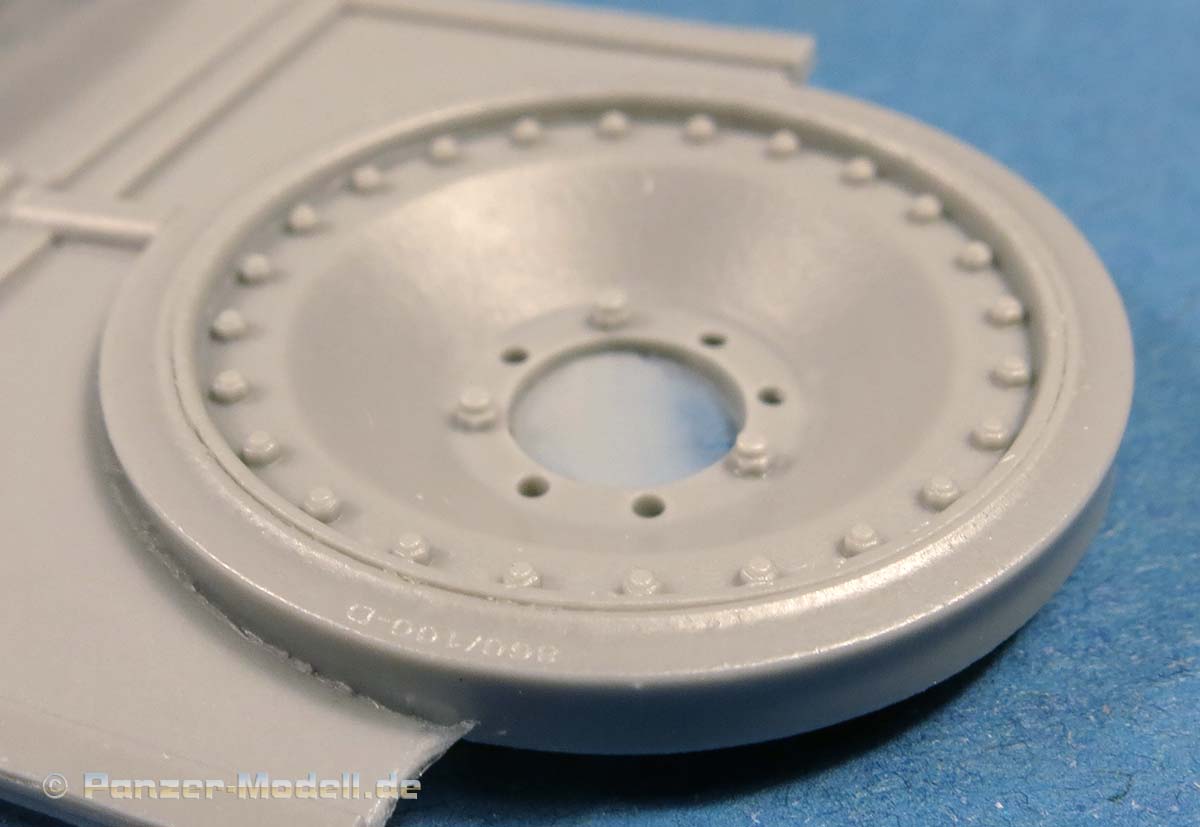 Die Laufrolle ist vom Typ mit 24 Bolzen, die alle sauber und sehr fein detailliert gegossen sind. Zudem wurde auf der Gummierung die feinen Buchstaben der Herstelleraufdrucke aufgebracht - sehr fein und realistisch gemacht!