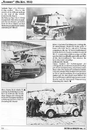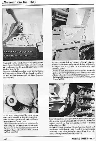 textmäßig wird ausführlich über die Entwicklung der Panzerjäger und explizit der "Hornisse" und später "Nashorn" besprochen, was für Merkmale sich finden, was geändert wurde, usw. Dieses wird ergänzt durch Tabellen und Tafeln über Zuweisungen dieser Fahrzeuge an einzelne Einheiten, Gliederungen und die Einsatzgeschichten bei einzelnen Panzerjägerabteilungen wann wo wie diese im Einsatz waren und Nashörner nutzten. Auf 18 Seiten werden dann sehr gute Fotos von Nashörnern im Einsatz gezeigt, wie immer mit guten zweisprachigen Bildunterschriften. Auch die 1/35 Maßstabszeichnungen sind gerade für ein paar Details sehr hilfreich. Die letzten 50 Seiten im Heft zeigen alle Details von den letzten 2 Fahrzeugen die jetzt in Museen stehen ... hier sollten dann keine Fragen mehr offen sein. Die Bildqualität ist durch die Bank gut und der Text weist auf die wichtigen Details hin. Auch dieses Heft kostet 16,80 Euro und bietet sehr viel Foto und Information für's Geld. gerade die Hornisse und Nashorn Neuauflagen von Dragon 2003 dürften diesen band wieder sehr interessant machen. Nuts & Bolts Vol.14 Nashorn - Sd.Kfz.164 |