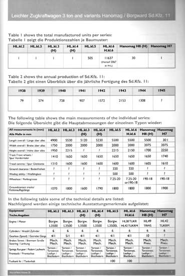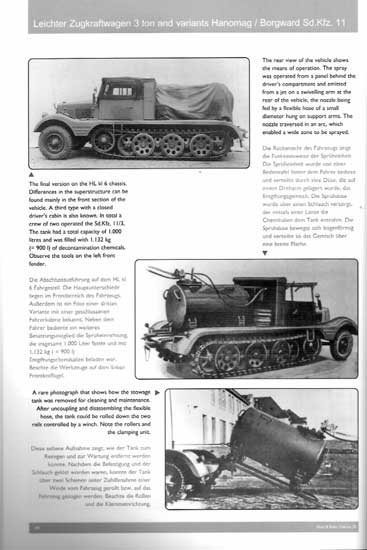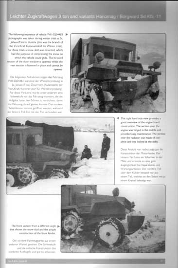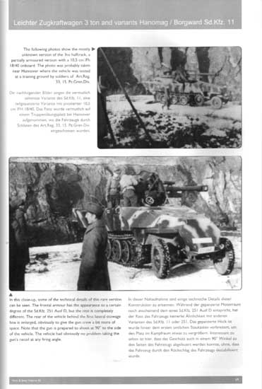Auf den ersten 24 Seiten geht es um die Entwicklung des Sd.Kfz.11, die Produktion mit Produktionszahlen und technischer Angaben aller Baumuster von HL.kl.2 bis Hanomag H8(H). Desweiteren werden die "normalen" Varianten Sd.Kfz.11/1 bis 11/5 beschrieben und besondere Varianten wie z.B. mit der 2cm FlaK oder auch der 10,5cm leFH, wie auch auf Weiterentwicklungen und den Einsatz bei der Artillerie, Nebeltruppe, Panzerabwehr, Funklenktruppe und Panzerabwehr eingegangen, was hochinteressant ist. Auch wird detailiert auf Farbgebung und Markierung eingegangen mit genauen Farbangaben und Vorschriften.