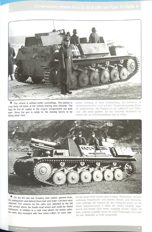 Die folgenden 66 Seiten bieten dann den wahren Augenschmaus, denn hier gibt es zeitgenössische Fotos satt. Jedes Foto ist in englisch und deutsch untertitelt und klärt über die gezeigte Szene und/oder Fahrzeug auf. Die Fotos sind allesamt von guter Qualität und beginnen mit Aufnahmen des gezogenen sIG33, dann über je ein Bild des sIG33 auf Panzer I und dem Prototypen auf Panzer II zu dem "Serien"fahrzeug mit 6 Laufrollen - hier finden sich knapp 80(!) tolle und teilweise bisher noch nie gesehene Aufnahmen diese Fahrzeugs.