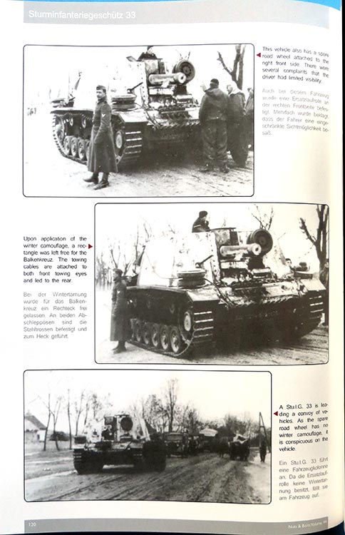 Umso umfangreicher ist dann der Abschnitt zum StuIG33 auf etwa 27 Seiten. Hier wird die Entwicklungsgeschichte, die technischen Daten und Komponenten bezüglich Aufbau, Fahrgestell, Antrieb, Panzerungsstärken, Bewaffnung und Funk.