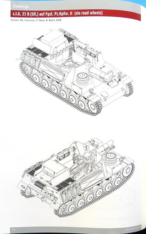 Die nächsten 16 Seiten zeigen dann die 15cm sIG und anderen Fahrzeug als 1:35 Maßstabszeichnungen und 3D Zeichnungsansichten. Diese sind wie immer von hoher Qualität und gerade für Modellbauer sehr hilfreich.