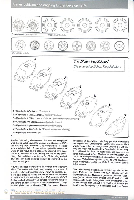 Nach rund 13 Seiten auf denen die komplette Entwicklungsgeschichte auf dem Weg zum Jagdpanzer 38 mit technischen Daten in Entwicklungen, Holz- und Vorserienmodelle, startet das Heft dann voll durch mit einer detaillierten Betrachtung der Serienfahrzeuge.auf weiteren 13 Seiten und darin neben Tabellen mit Daten die für Modellbauer wichtigsten Infos und Zeichnungen, nämlich die Darstellung der unterschiedlichen Geschützblenden und vor allem die zeitliche Einordnung der Produktionen und deren markante Features. So kann man am besten nachvollziehen was früh/mittel/spät am Modell für Details aufweisen muss, bzw. wer sein Modell zeitlich festlegen will, kann es anhand der Tabelle exakt machen.