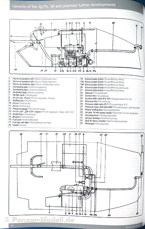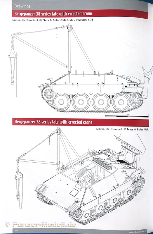 Die nächsten 28 Seiten zeigen dann die verschiedenen Versionen als 1:35 Maßstabszeichnungen und 3D Zeichnungsansichten. Diese sind wie immer von hoher Qualität und gerade für Modellbauer sehr hilfreich. Gerade für die Unterschiede der einzelnen Versionen und auch der Abarten wie Jagdpanzer 38 starr oder Bergepanzer.