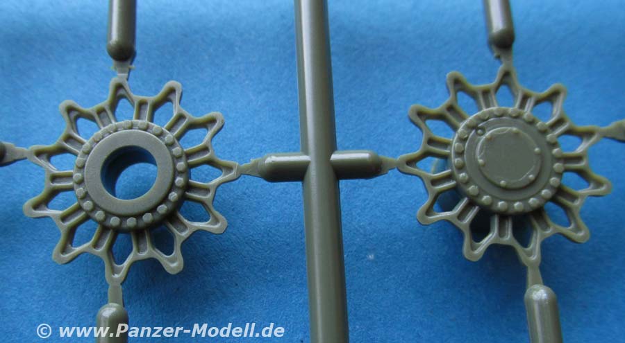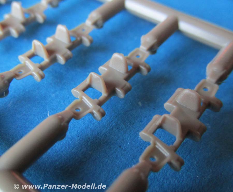 Auf die nun 4 Laufwerke werden dann die 4 Kettenstränge aufgezogen, die aus Einzelgliedketten zusammengebaut werden. Diese sitzen im Spritzling an jeweils nur zwei Angüssen sitzen. Die Glieder sind sehr gut und vor allem sauber gespritzt - keinerlei Auswurfstellen sichtbar.