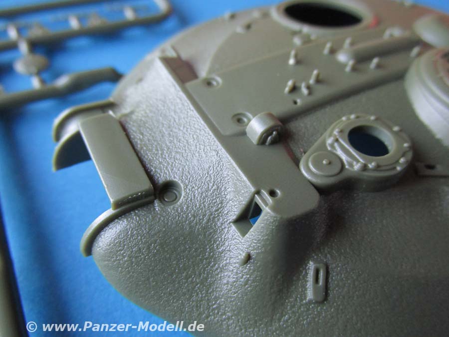 Die Luken lassen sich offen oder geschlossen darstellen. Das Kanonenrohr ist in zwei Halbteile geteilt und weist eine schöne geschlitzte Mündungsbremse auf.