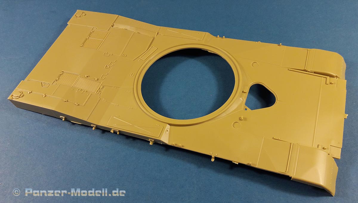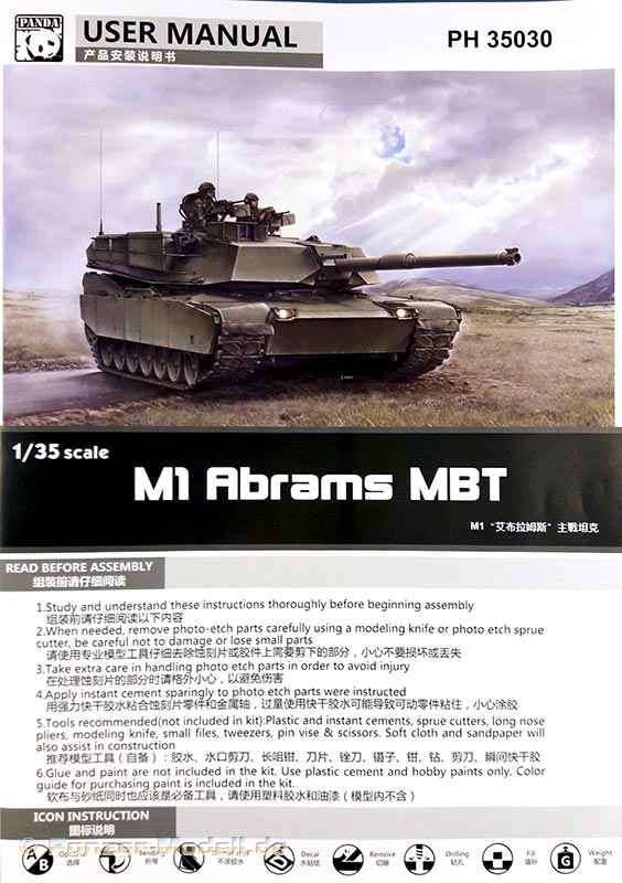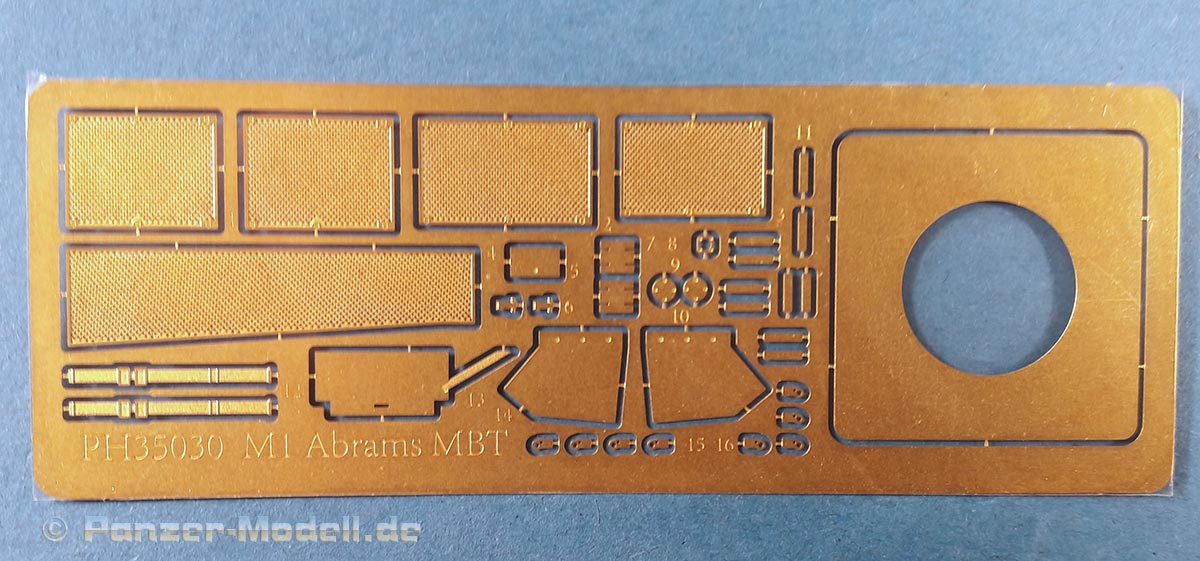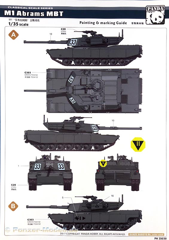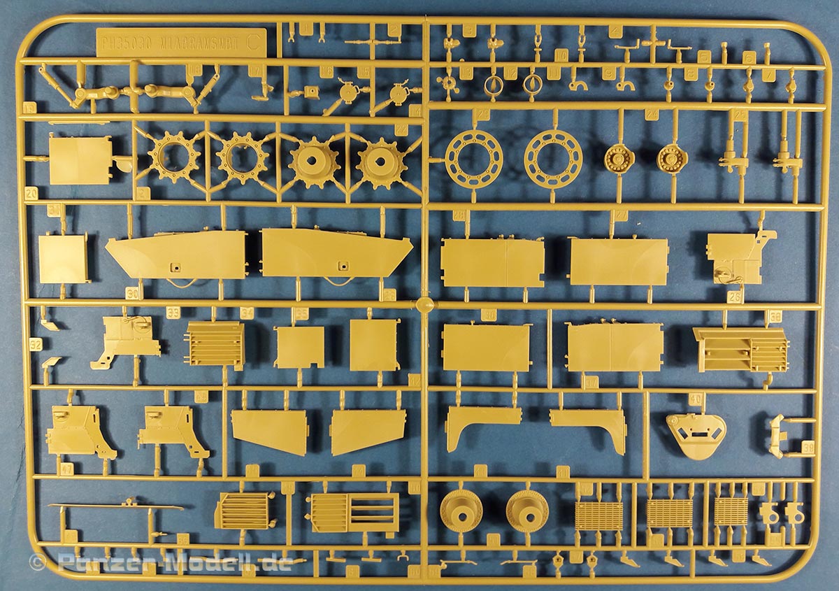 M1 Abrams MBT Der M1 Abrams ist wohl einer der berühmtesten und meist präsenten Kampfpanzer der Welt. Seit seiner Einführung in die US Army 1980 bildet er das Rückrat der dortigen Panzertruppe. Nach vielen Jahren ist nun erstmals ein zeitgemäßes Modell der Ursprungsversion des Abrams erschienen des M1 „Slick“ mit 105mm Kanone und kurzem Turm. Bisher gab es den M1 nur von Tamiya (eigentlich ein XM1 Prototyp), seinen Klon von Academy und ein eher schlechtes Modell von ESCI (Auch verkauft unter dem AMT und ERTL Labels). Schon das Deckelbild weiß zu gefallen, es zeigt einen Abrams in Forrest Green anscheinend auf einer Schießbahn. Beim Öffnen des Kartons zeigen sich sechs Spritzlinge in beigen Plastik, jeweils eine separate Ober- und Unterwanne, ein Spritzling in klarem Plastik, eine kleine Platine mit Ätzteilen, zwei gedrillte Drähte für die Abschleppseile, Decals, ein DIN A4 Blatt mit Markierungsvorschlägen und die Bauanleitung. An den Spritzlingen ist augenscheinlich weder Fischhaut zu finden noch sind auffällige Auswerfermarken an später sichtbaren Stellen zu erkennen. Die Bauteile zeigen sich durchweg gut bis sehr gut detailliert auch feinste Details wurden berücksichtigt. Besonders wichtig sind für mich immer die Verschlüsse der Staukisten an US Panzern, meistens sind diese nur als „Klumpen“ angegossen nicht jedoch hier. Diese finden sich sauber und filigran ausgeführt an den Spritzlingen. Offensichtlich wurden alle Merkmale der frühen M1 am Modell umgesetzt. So findet sich eine schöne M68 105mm Kanone (leider zweigeteilt), der obligatorische kurze Turm, die typische Auslegung der Oberwanne, die frühe T-156 Kette und die Rückhalteringe für die Triebräder. Die beiliegenden Ätzteile sind durchgehend Sinnvoll und stellen Lüftergitter, Abdeckungen, Ösen und Verschlüsse dar. Für die Periskope, Optiken und die Ölstandsanzeigen an den Laufrollen liegen schöne Klarsichtteile bei. Die T-156 Ketten befinden sich an 4 Spritzlingen ein Kettenglied wird jeweils mit einem Mittelsteg und zwei Endverbindern mit einem anderen verbunden. Dies ist wohl der aufwändigste Teil des Bausatzes. Hervorzuheben sind noch die Seitenschürzen, diese bestehen je Seite aus sechs Einzelteilen und können separat angebracht werden. Zudem kann man zwischen dem frühen oder späten letzten Schürzenelement wählen. Die Bauanleitung führt in zwölf Schritten zum fertigen Modell und ist sehr übersichtlich. Als Markierungsvarianten stehen 4 Fahrzeuge zur Auswahl. Eines in MERDC und 3 in Forrest Green. Leider sind keine Angaben zu den Einheiten vorhanden. Aber offensichtlich ist ein Fahrzeug in REFORGER Markierungen abgebildet leider fehlen zu der Variante die Bumper Codes. Die Farbangaben beziehen sich auf Mr. Color Farben von Gunze. Mein Fazit: Endlich ein zeitgemäßer früher M1! Unbedingte Kaufempfehlung. Für einen Preis von ca.45 € kann man hier nichts falsch machen.