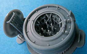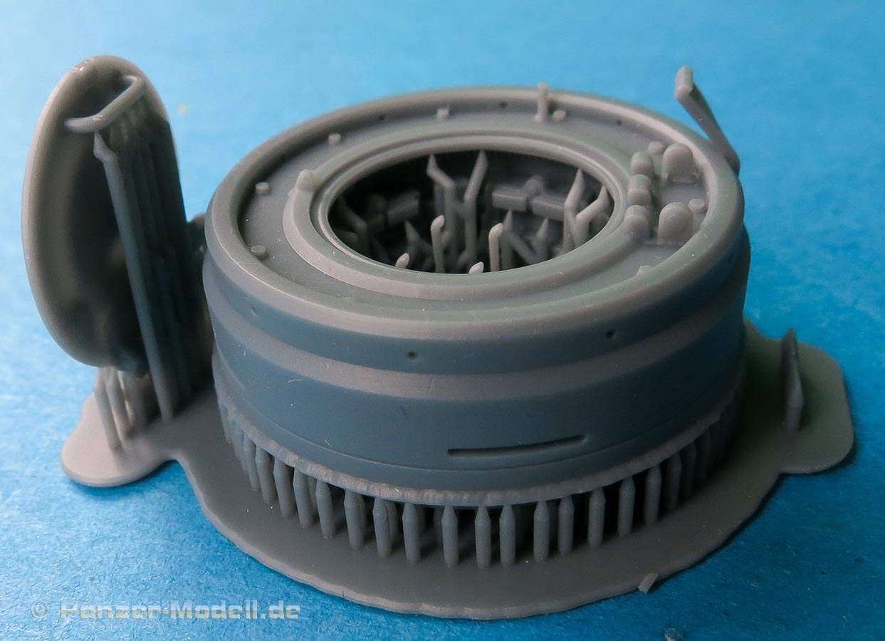 Die Kuppel insgesamt ist einteilig mit allen Details innen und außen schon vollständig eingedruckt. inklusive der markanten Sichtschlitze. Der Lukendeckel liegt einzeln bei und auch hier alle Details sehr schön und sauber gedruckt. Durch die einzeln beiliegende Luke kann man die Kuppel offen oder geschlossen bauen.