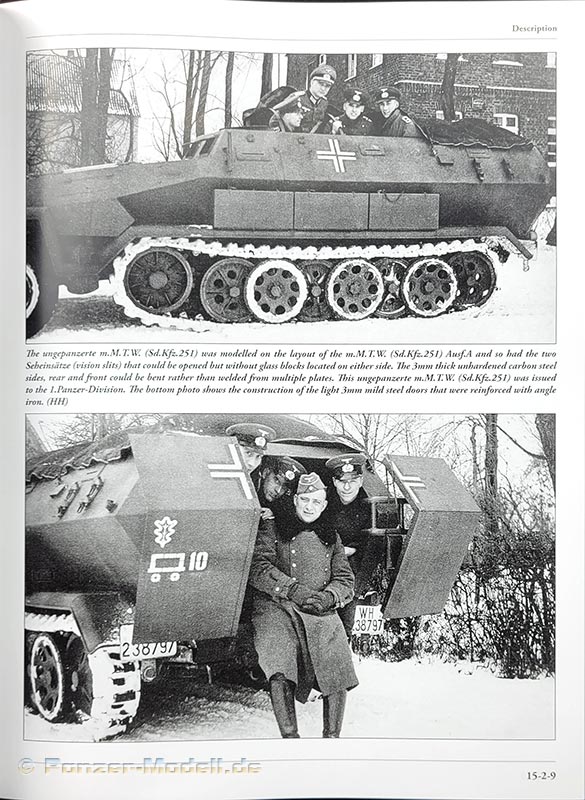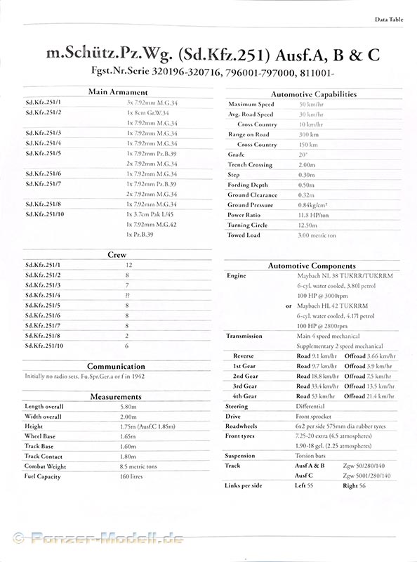 Der Großteil des Heftes geht dann die einzelnen Unterarten des Sd.Kfz.251, wie sie bis 1942 produziert wurden durch und zeigt Fotos auch vom Innenraum mit Erklärungen sowie weiteren erklärenden Text zu Einsatz und Produktion. Diese Aufstellung umfasst 1-5 Seiten pro Unterart und enthält natürlich das 251/1, 251/2, 251/3, 251/4, 251/5, 251/6, 251/7, 251/8, 251/10, schw.Wurfgerät auf m.gp.Zgkw. und als Zugführerwagen.