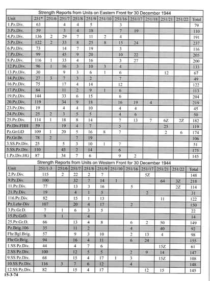 Die restlichen Seiten des Heftes werden mit großen und übersichtlichen Tabellen gefüllt, die Produktions- und Bestandszahlen von verschiedenen Zeitpunkten und Fronten für die unterschiedlichen Varianten zeigt. Eine wirklich hervorragende Übersicht nach der man auch gut ersehen kann wann wo wieviele Versionen verfügbar waren.