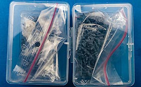 Im stabilen Pappkarton finden wir zwei Klappdeckelboxen aus Plastik, die die 3D gedruckten Teile perfekt vor Beschädigungen schützt.