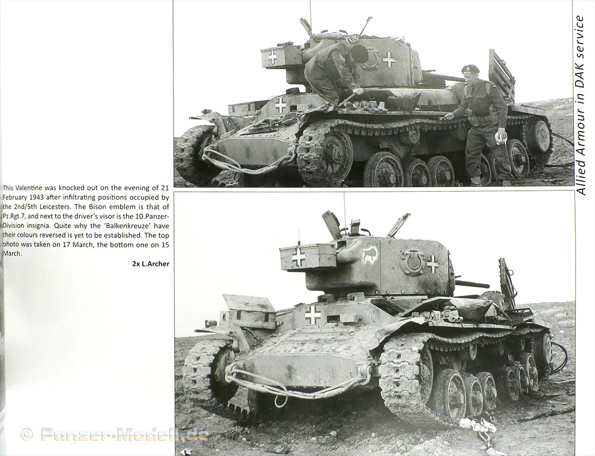 Die Autoren von Panzerwrecks haben es nun wieder mal geschafft die 96 Seiten dieses DIN A4 Bandes im Querformat mit 156 tollen und spannenden Fotos zu füllen. Wie bereits gewohnt, sind diese Fotos wieder in einer unglaublich hervorragenden Bildqualität, auch bei komplett seitenfüllender Darstellung. Zusätzlich zu den schönen Fotos gibt es sechs Farbillustrationen von einzelnen Aufnahmen von Felipe Rodna. Diese sind ganzseitig direkt gegenüber des Originalfotos abgedruckt und zeigen den Panzer in exakt der gleichen Position und gibt so eine tolle Illustration dessen, wie man das schwarzweiß Foto interpretieren kann. Auch in diesem Review sei es nochmal für alle, die die Serie noch nicht kennen, explizit gesagt: trotz des Titels sind die gezeigten Fahrzeuge nicht immer wirklich Wracks - viele weisen Beschädigungen auf, sind aber ansonsten noch relativ oder sogar komplett intakt. Andere sind tatsächlich Wracks, zeigen aber damit bemerkenswerte Details, die man sehen sollte. Auf jeden Fall hervorragendes Vorbildmaterial für Dioramen- und Modellbauer. Gerade was Ausrüstung und Tarnschemen an den Fahrzeugen angeht, sind diese Fotos Gold wert. Die Fotos sind jeweils mit ausführlichem, englischem Erklärungstext versehen, der auf Besonderheiten bzw. Ort und Zeit der Fahrzeuge auf den Fotos hinweist. Dieser 22.Band hat diesmal auch nur zwei größere Hauptthemengebiete - das eine "Allied Armor in DAK Service" umfasst 18 Seiten und zeigt einige seltene und hochinteressante Fahrzeuge der Alliierten wie Stuart I, Crusader oder auch Valentines, die im Dienste des DAK standen und für Modellbauer spannende Vorlagen gibt diese ins Modell umzusetzen. Bei dem anderen Thema geht es auf 16 Seiten um den Pz.Jgr.38 für 7,62cm Pak 36, auch als Marder III Sd.Kfz.139 bekannt. Hier werden tolle und bisher unveröffentlichte, großformatige Aufnahmen dieses Panzerjägers gezeigt - auch hier wieder sehr interessant für Modellbauer bezüglich Bemalung, Markierungen, Ausrüstungsgegenständen, usw. Den Rest des Heftes füllen dann Seiten voll mit Fotos der verschiedensten Panzerfahrzeuge vom Schauplatz des Wüstenkriegs in Afrika. Größtenteils gute und bisher nie gezeigte Aufnahmen und dazu ausführliche Bildunterschriften, die über das Fahrzeug, Einheiten, Ort und Zeit, sowie Besonderheiten des Fahrzeugs und den Beschädigungen Auskunft geben. Insbesondere die Reihe an Fotos der verschiedneen Panzer III timmt gut in das Thema ein und gibt gute aufschlussreiche Einblicke in diese Versionen der Panzer III, Deatils und Merkmale. Besonders interessant sind die Aufnahmen vom Panzer III, der mit Beton verkleidet wurde. Unter den gezeigten Fahrzeugen im Heft sind Panzer IV Ausf.F und G, Panzer III Ausf.H, J und M, gr.Pz.Bef.Wg. Ausf.H, Panzer II Ausf.F, 15cm sIG 33B Sfl, 4.7cm Pak(t) Sfl, Stuart I (Beute), Crusader II (Beute), Valentine (Beute), Pz.Jgr.38 für 7,62cm Pak 36, Lg.s.FH.13 (Sf), M13/40, M3 halftrack (Beute), Sd.Kfz.9, Sd.Kfz.251/10, Sd.Kfz.251/8, Sd.Kfz.251/6, Sd.Kfz.250/10, Sd.Kfz.250 w/2.5cm Hotchkiss PaK, Sd.Kfz.231, 232 und 233 (8-Rad), s.Pz.Fu.Wg. Sd.Kfz.263 (8-Rad), Kl.Pz.Fu.Wg. Sd.Kfz 261 und Sd.Anh.116 Wie die vorigen Bände, bietet dieser 22. Band der Panzerwrecks Reihe wieder hervorragendes und seltenes Fotomaterial - für Historiker und Modellbauer eine grandiose Fundgrube und mit den dazugehörigen Informationen zu den Fotos und Fahrzeugen einfach Gold wert. Die ergänzenden Zeichnungen sind eine schöne Zugabe und werten das Heft nochmal weiter auf. Sehr empfehlenswert! Panzerwrecks Vol.22