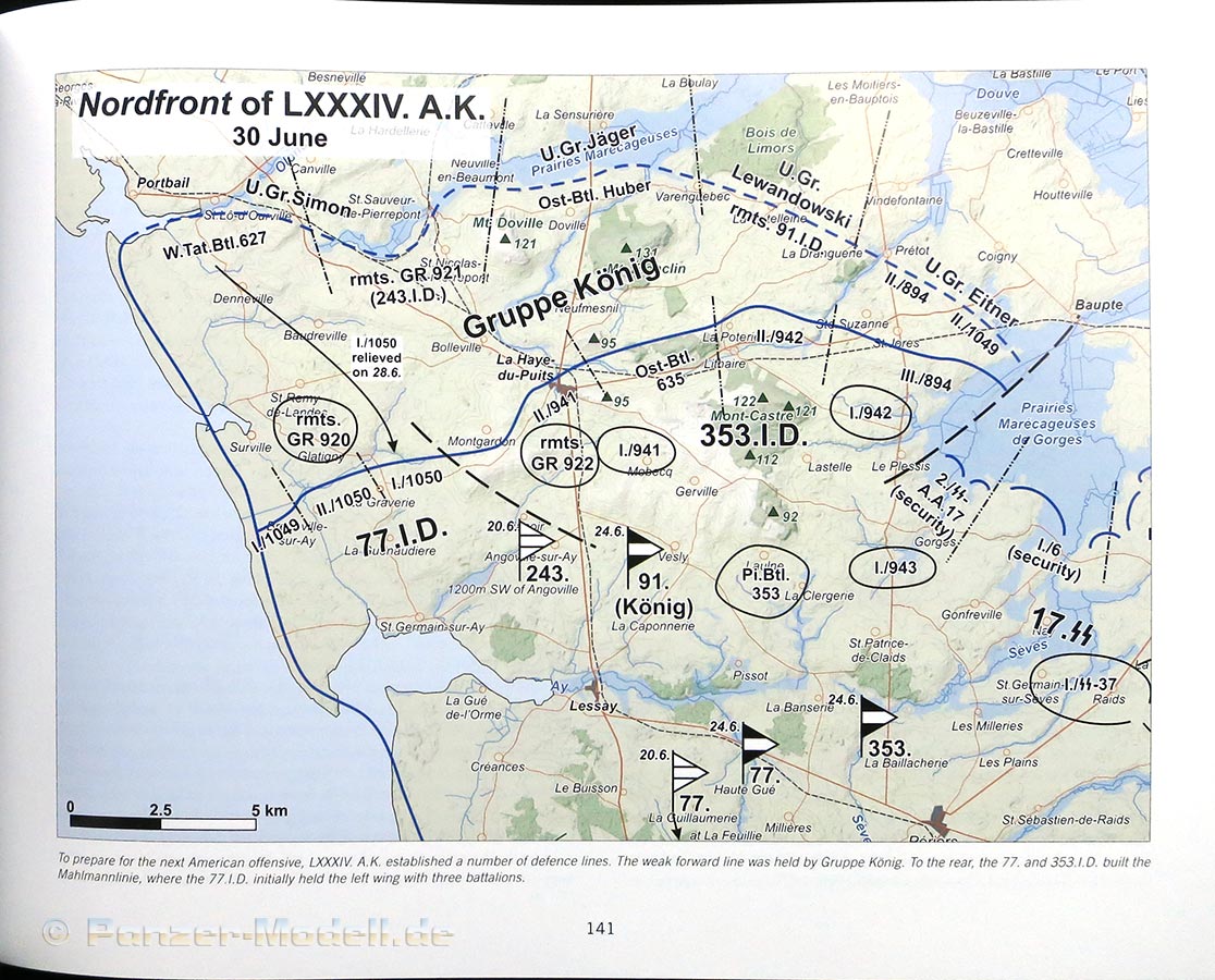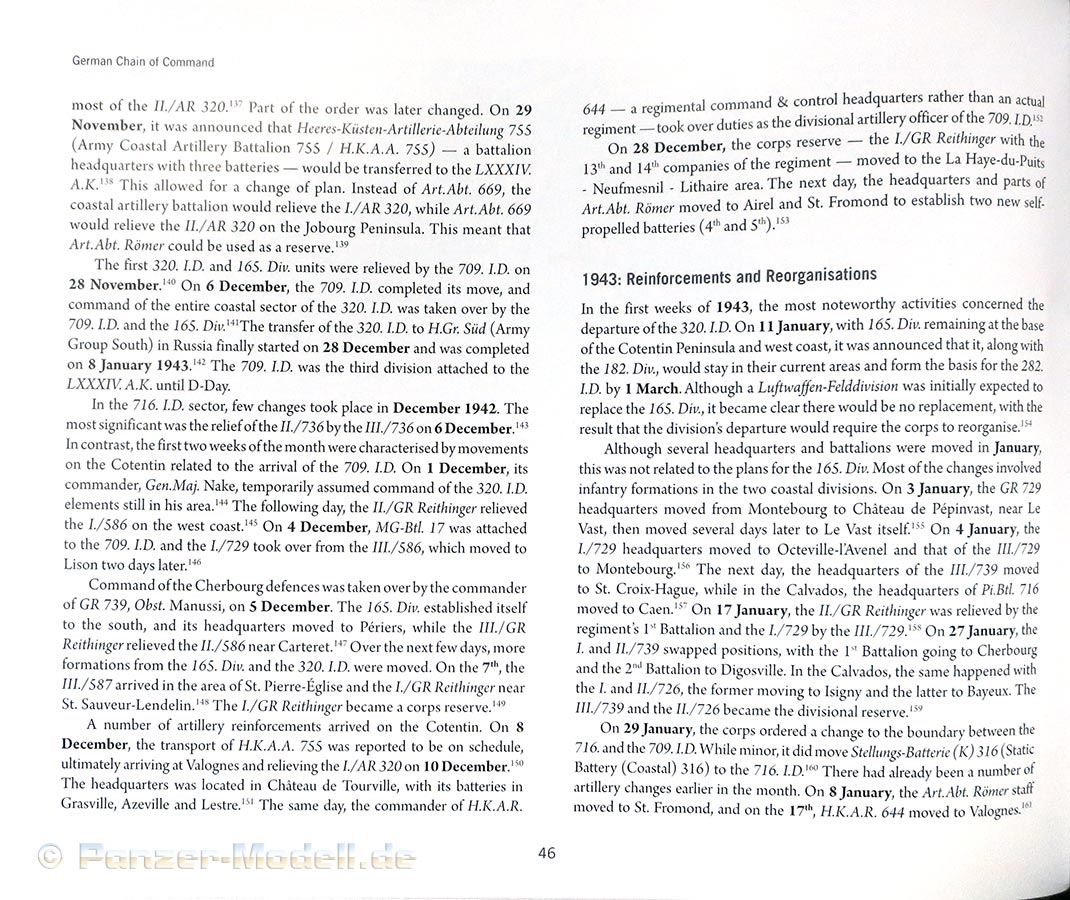Letzteres wird dann weiter detailliert aufgedröselt mit einer historischen Aufarbeitung dieses Armeekorps - Jahrweise wird genau beleuchtet was sich mit der Ankunft 1941 in der Normadie getan hat, Zu- und Abgänge bis 1944 die Vorbereitungen zur Abwehr der Invasion angegangen werden.