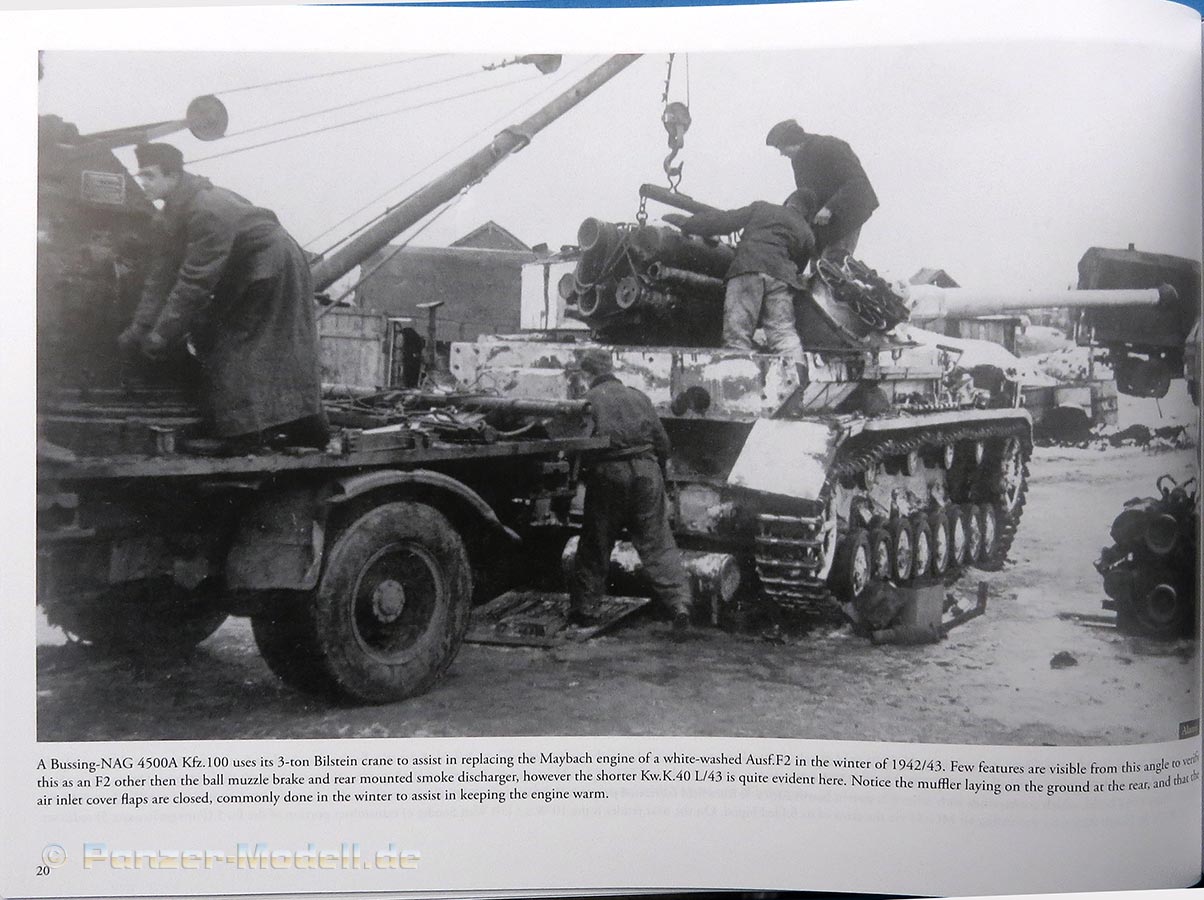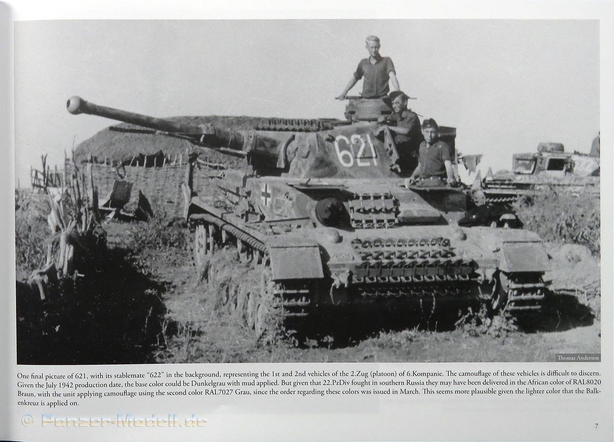 Das erste Kapitel hat dsen Panzer IV Ausf. F2 (G) zum Thema - hier finden wir viele tolle Fotos der sonst eher seltenere Version mit der L/43 Kanone und der Einkammer-Mündungsbremse. Die Fotos zeigen verschiedene Fahrzeuge an verschiedenen Fronten und mit den verschiedensten Tarnbemalungen - angefangen von einfarbig dunkelgrau, was durchaus interessant ist.