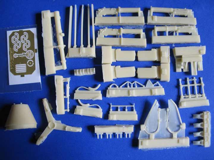 Das selbe Flugabwehrgeschütz, das Maxim-Quadrupel, gibt es von der Firma Plusmodel einzeln käuflich zu erwerben, und bietet 38 Resin- und 14 Ätzteile, sowie ein sehr weiches Stück Draht. Die Anleitung ist Platz sparend auf einem dünnen Papierstreifen untergebracht und beschildert den Bauvorgang größtenteils gut verständlich.