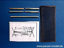 Von plus model erhielten wir drei tolle neue Sets mit Stacheldraht im Maßstab 1:35. Jedes der drei Sets enthält eine Ätzplatine mit äußerst fein detaillierten Nachbildungen von Stacheldraht. Dazu liegen "echte" Kanthölzer bei um einen sogenannten "Spanischen Reiter" zu bauen. Die Hölzer haben eine Kantenlänge von 2 x 2 mm. Vier der Hölzer sind 50 mm lang und eines liegt in 100 mm Länge bei. Auf der Platine ist der "Stacheldraht" in Windungen befestigt so dass man ihn ganz nach Wunsch ablängen kann. Die Drahtlänge dürfte ausreichen um weit mehr als einen Spanischen Reiter anzufertigen. Eine kleine s/w Zeichnung liegt als Bauanleitung bei.