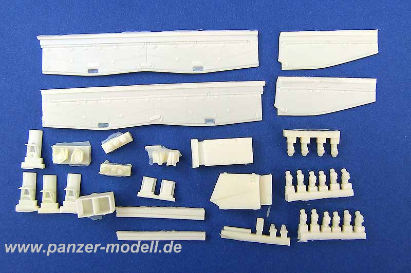 Wer bislang seinen Tamiya Leopard 2A6 auf die “alten Kettenschürzen” umrüsten wollte musste sich mit dem Revell Leopard 2A4 Bausatz behelfen. Pro Art Models, ein Kleinserienhersteller aus Belgien schafft hier Abhilfe. Mit dem Set PAU-35018 erhalten wir einen Resin-Umbausatz in allerbester Qualität. Die Angüsse sind erfreulich klein gehalten, befinden sich an unkritischen Stellen und dürften sich recht einfach entfernen lassen. Luftblasen oder Verzug der Bauteile waren beim Muster nicht zu entdecken. Enthalten sind hier zum einen die „alten Kettenschürzen“ welche wirklich toll gemacht sind. Feinste Details auf den Bauteilen, bereits ausgeschnittene Trittöffnungen, Verriegelungen der Kettenblenden in verschiedenen Stellungen dargestellt... Das sind nur einige der Highlights. Besonders interessant ist aber dass das hintere, letzte Stück der Kettenblende einzeln beiliegt. Man könnte es also auch hochgeklappt für die Fahrt im Gelände anbringen. Ach, habe ich schon erwähnt dass das Muster der Gummistruktur auf der Innenseite der Blende auch vorhanden ist? Weiterhin finden sich in dem Set die neue Nebelwurfanlage 6/2, Antennensockel für Fahrzeuge der Bw und für niederländische Leoparden, Unterlegkeile mit Staukasten sowie weiteres Zubehör um den Leopard 2A5 (NL) oder 2A6 (NL) zu bauen. Als Basisfahrzeug ist der Tamiya Leopard 2A6 aufgeführt, das Set ist mit Einschränkungen aber auch am Tamiya Leopard 2A5 verwendbar. Als Bauanleitung liegt ein DIN A4 Blatt bei mit einer Bauteilbeschreibung, Zeichnungen und Hinweisen für die Montage und die Verwendung der Bauteile je nach zu bauender Version. Das Set kostet 13,90 EUR. Das Preis- / Leistungsverhältnis passt hier auf jeden Fall.