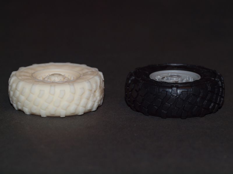 Das Set enthält fünf Reifen aus cremefarbenen Resin. Die Qualität des Profiles ist erstklassig; lediglich bei den Angüssen gab es einige Lufteinschlüsse und bei der Nabe des Ersatzrades ein wenig Fischhaut. Diese ließ sich aber mit einem scharfen Skalpell recht schnell entfernen.