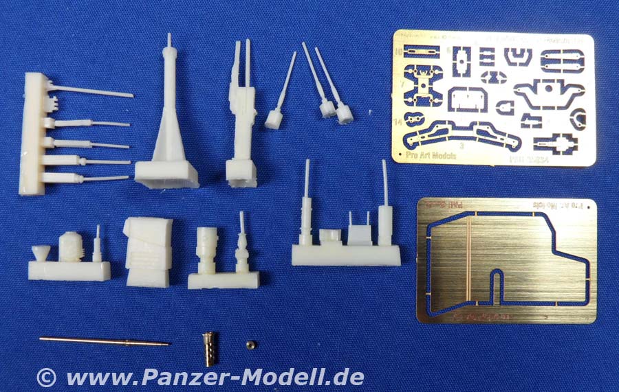 Modern .50 and Mk93 cradle (with gun shield, pedestal & TWS) „Kleiner Karton, großer Name und exorbitanter Inhalt“ wäre wohl der passendste Untertitel zu diesem Set für den LMTV „Special Forces War Pig“. Sozusagen ein Zurüstsatz zum Umbausatz. Geliefert wird eine kleine, aber sehr feine, Anzahl heller Resinteile, eine Platine Ätzteile und ein aus Messing gedrehtes, dreiteiliges Rohr! Und das in erstklassiger Qualität. Bravo! Das Highlight ist sicherlich der Lauf des MGs, welcher aus drei Teilen besteht, wobei das kleinste als Abstandshalter zwischen Lauf und gelochtem Mantel dient. Die bisher beste Lösung um den Mantel auf Abstand zu halten, finde ich. Ein weiteres Highlight ist das TWS (Wärmebildzielgerät), welches gleich in zwei Ausführungen beiliegt. Der Rest des Satzes, wie etwa Munitionskiste, MG-Korpus, Schild und der Standfuss stehen dem in Nichts nach! Insgesamt herausragend, aber sicher ein ganz schönes Stück Arbeit, welche eher nur dem erfahrenen Modellbauer anzuraten ist. Fazit: Unter den Top-3 der modernen .50cal M2 in der ersten Hälfte!