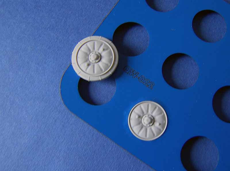 Diese Schablone bietet die passenden Aussparungen für den kompletten Laufrollensatz der PT-76 von Trumpeter. Das Material ist angenehm fest, man kann die Laufrollen bequem einlegen und dennoch werden sie stramm und sicher in der Aussparung gehalten. Die Anwendung ist sehr simpel: Die Laufrollen werden in der gewünschten Farbe der Gummibandage komplett lackiert. Nach vollständiger Trocknung werden die Laufrollen in die Schablone eingelegt und in der entsprechenden Tarnfarbe lackiert.