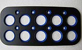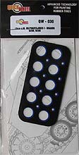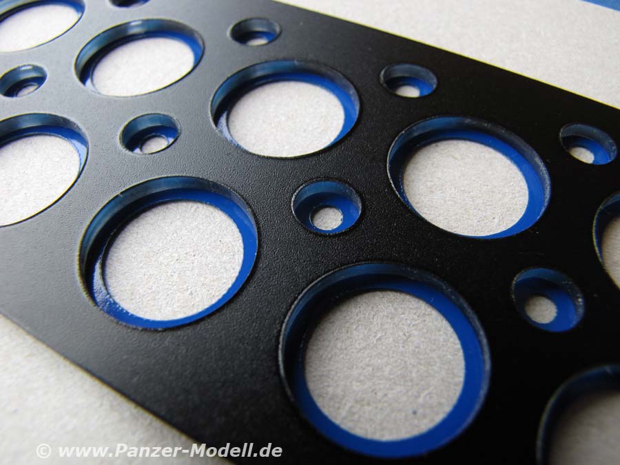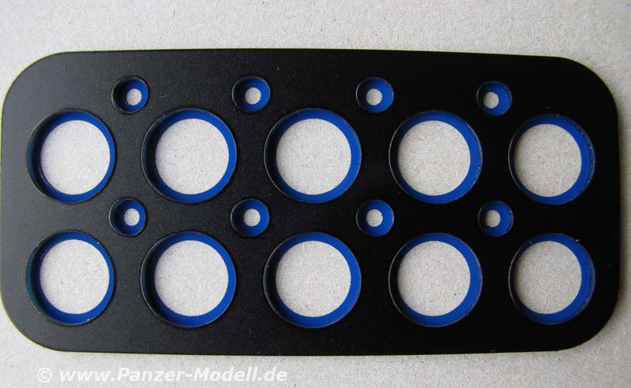 In dieser Schablone sind Aussparungen für alle 10 Laufrollen und 8 Stützrollen, sodass man das komplette Radset in einem Durchgang fertiglackieren kann, ohen Angst um die Gummierung zu haben, denn diese wird so auber und exakt abgedeckt..