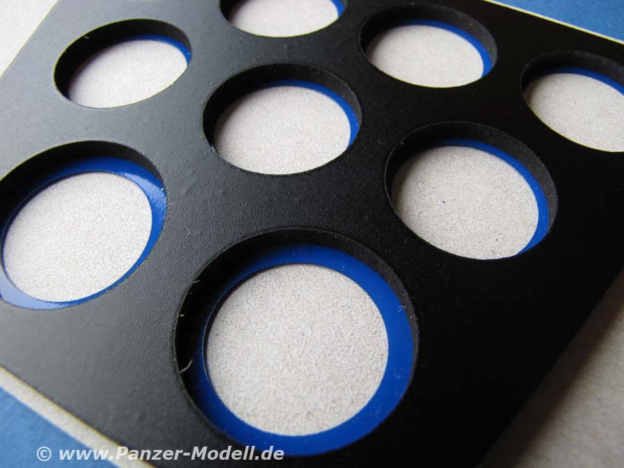 Wie die übrigen Sets ist auch dieses aus festem, dicken Material in das die Laufrollen schön hineingelegt werden können, um sie zu lackieren und mit einer blauen Folie von der anderen Seite die Gummierung abgedeckt ist.