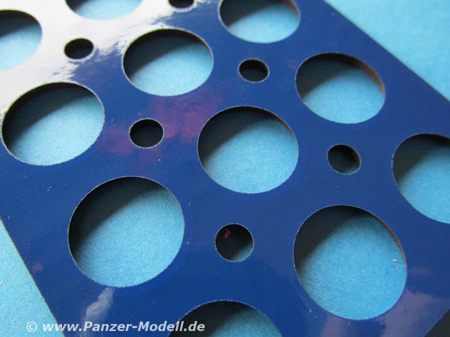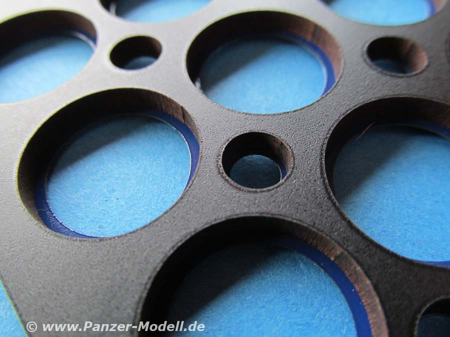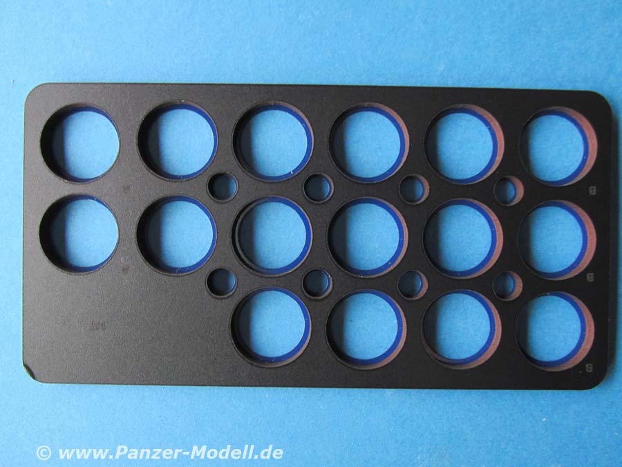 Diese Schablone bietet die entsprechenden Aussparungen für die Laufrollen der Leopard 1 Bausätze aus dem Hause Takom.