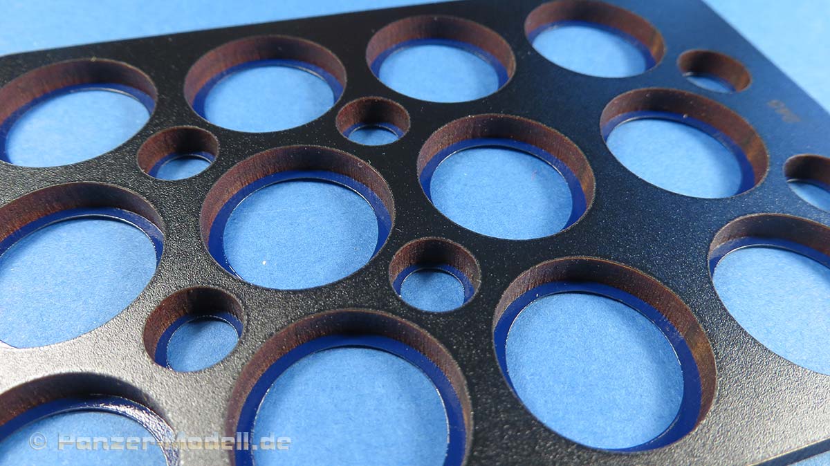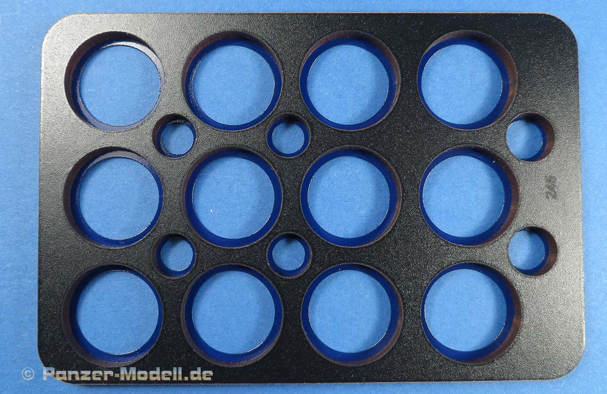 Der große Vorteil dieser Art Spritzschabone ist, dass die Laufrollen und Stützrollen zum einen ALLE gleichzeitig lackiert werden können und zum anderen exakt und schnell hineingelegt werden können und nicht wie bei allgemeinen Kreisschablonen immer nur jedes Rad einzeln.
