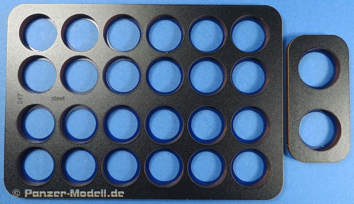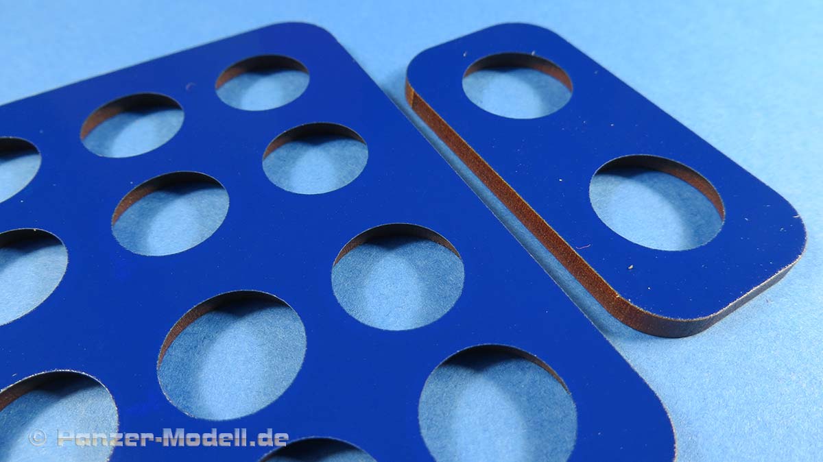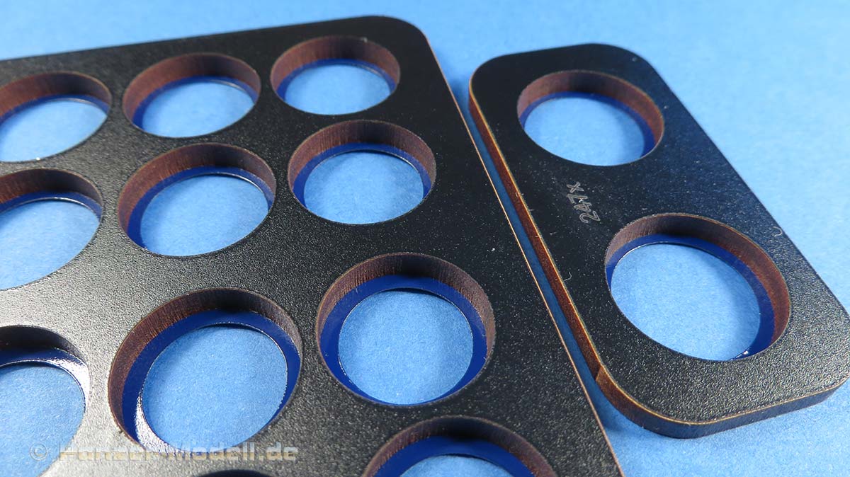 Wie bekannt und beliebt, sind auch diese Schablonen aus festem, dicken Material, in das die Laufrollen und Treibräder schön saugschmatzpassend hineingelegt werden können, um sie zu lackieren.