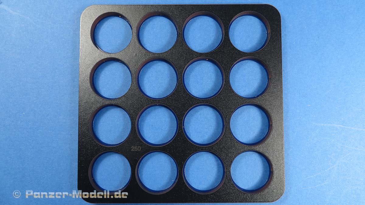 Der große Vorteil dieser Art Spritzschabone ist, dass die Laufrollen zum einen ALLE gleichzeitig lackiert werden können und zum anderen exakt und schnell hineingelegt werden können.