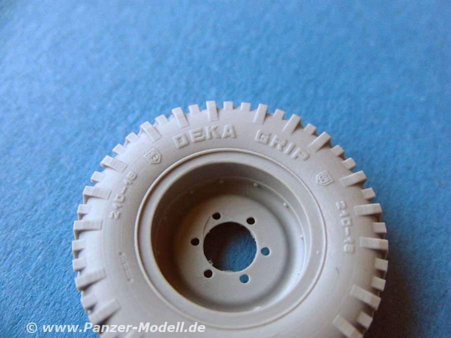 Der Guss der Reifen ist wahninnig gut in feinster Detaillierung und zusätzlich quasi ohne Anguss - das machts für den Modellbauer sehr angenehm. Zusätzlich finden sich auf den Reifenflanken sogar die entsprechenden Herstelleraufdrucke - in diesem Fall ist es Deka Grip. Für beide Frontreifen liegen natürlich noch die passenden Naben bei. ABER nicht einfach nur ein Set Naben - nein ... Quickwheel hat hier sogar ein zweites Set Naben aus Resin beigelegt, die bereits mit Verzurrungsösen versehen sind. Dies ist ein ganz besonderes Detail.