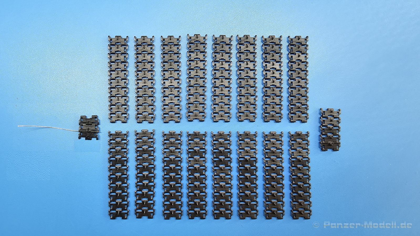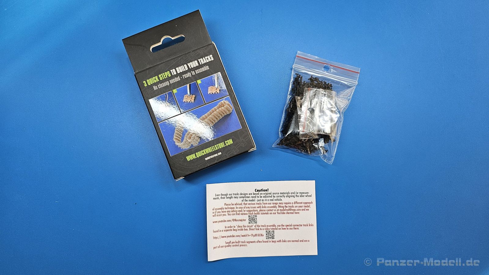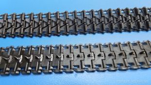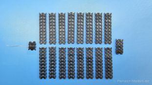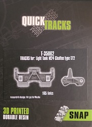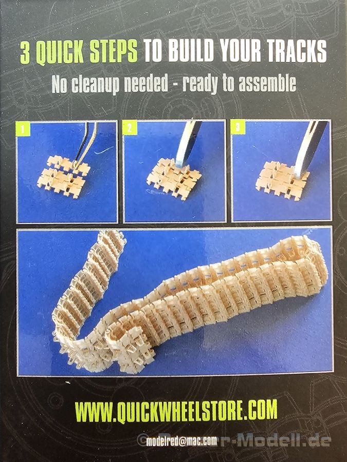 Tracks for: Light Tank M24 Chaffee Type T72 Der M24 Chaffee war ein U.S. amerikanischer Aufklärungspanzer, der ab Dezember 1944 zum Einsatz kam und mit Modifikationen in verschiedenen Ländern bis in die 1990-er Jahre seinen Dienst tat. Für die M24 im 2. Weltkrieg bringt uns QuickTracks 3D-gedruckte T72 Stahlketten. Der Karton ist 100 x 75 x 30 mm groß, die Rückseite mit Langloch zum Aufhängen des Kartons in einen Verkaufsständer ca. 130 mm lang. Auf der Rückseite befinden sich Fotos, wie man die Ketten zusammenbauen kann (mit Pinzette!). In zwei wiederverschließbaren Plastiktüten befinden sich 165 Einzelglieder und Ersatzglieder und Draht. Der Druck ist sehr gut - sauber, detailliert und fehlerfrei. Es gibt mit bloßem Auge keine sichtbaren Drucklamellen, sondern nur feine, glatte Flächen. Man sieht auch keine Reste der Druckstützstrukturen und kann also gleich mit dem Zusammenbau loslegen. Die Gussnummern in den Feldern sind vorhanden, wenn auch mit dem bloßen Auge schwer zu erkennen. Stege, Schrauben und Durchbrüche für Antriebszähne und sind gut und sauber ausgearbeitet. Es gibt zusätzliche Glieder, die durchgehende Bohrungen für die Kettenbolzen haben und scheinbar als Ersatzkettenglieder gedacht sind. Es gibt ein kurzes Stück Draht zur Darstellung der Bolzen, mit dem man diese Glieder verbinden kann. Der Zusammenbau ist einfach. Von der auf der Packung angegebenen Anleitung, die Glieder mittels Pinzette zusammenzusetzen, halte ich nicht viel. Auch wenn die Glieder klein sind, geht es mit den Fingern meiner Meinung nach am einfachsten. Man setzt ein Glied an einer am nächsten Glied an und klickt sie dann zusammen. Die Kette bleibt voll beweglich, trotzdem hält sie gut zusammen, dass sie auch leichten Zug aushält. Ich konnte innerhalb kürzester Zeit beide Kettenstränge zusammensetzen. Ein 1-minütiges Video des Herstellers zeigt, wie man die Ketten von Hand zusammensetzen kann. Sie sehen nicht nur gut aus, sondern sind auch sehr leicht zusammenzusetzen und bleiben zudem voll beweglich. Der Preis um die 30 Euro für 3D-gedruckte Kette ist heutzutage im normalen Bereich. Meine ersten Quicktracks und ich muss sagen, dass ich begeistert bin und sie mit gutem Gewissen auch für Anfänger weiterempfehlen kann.
