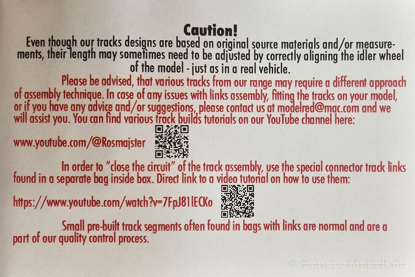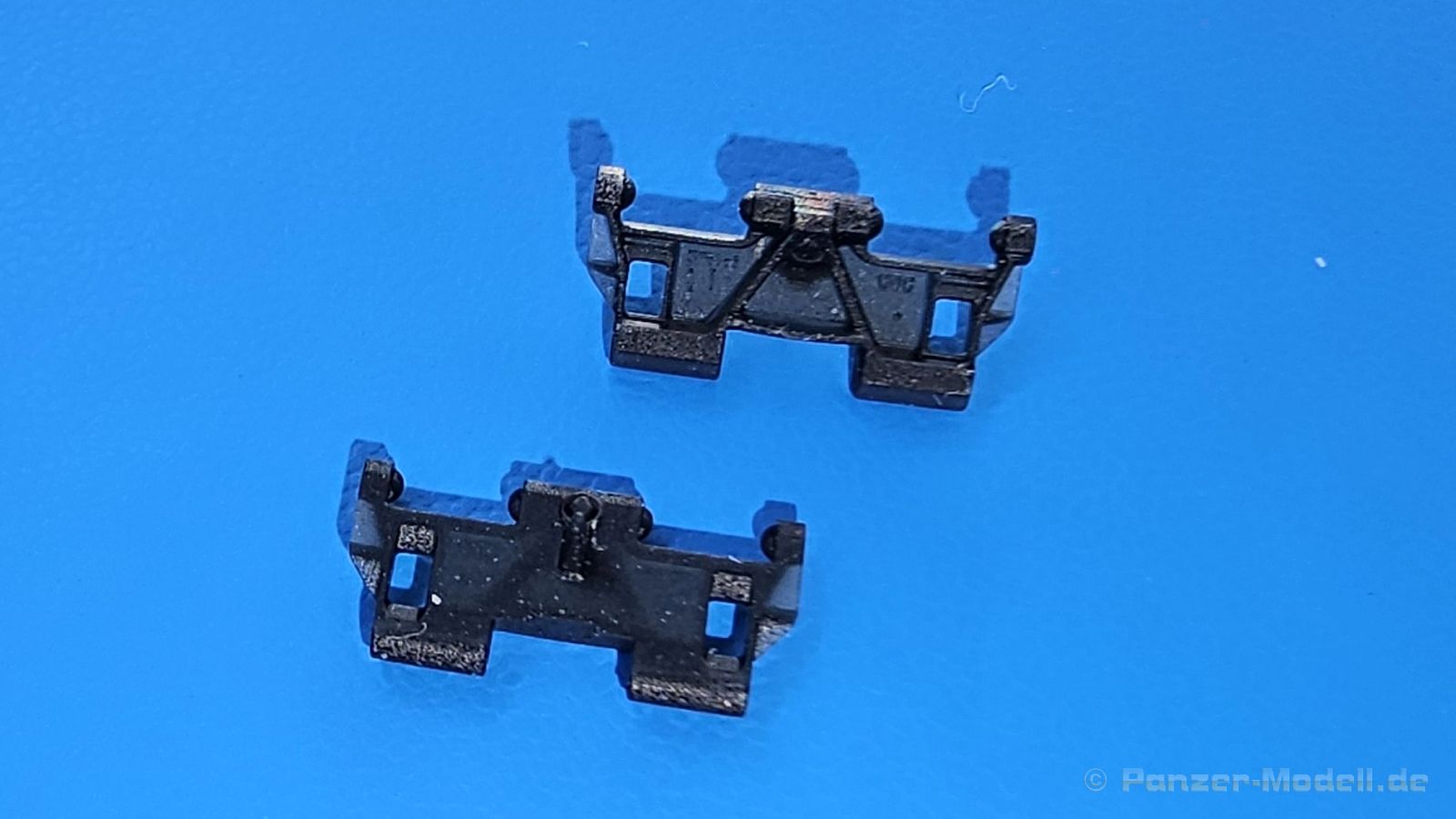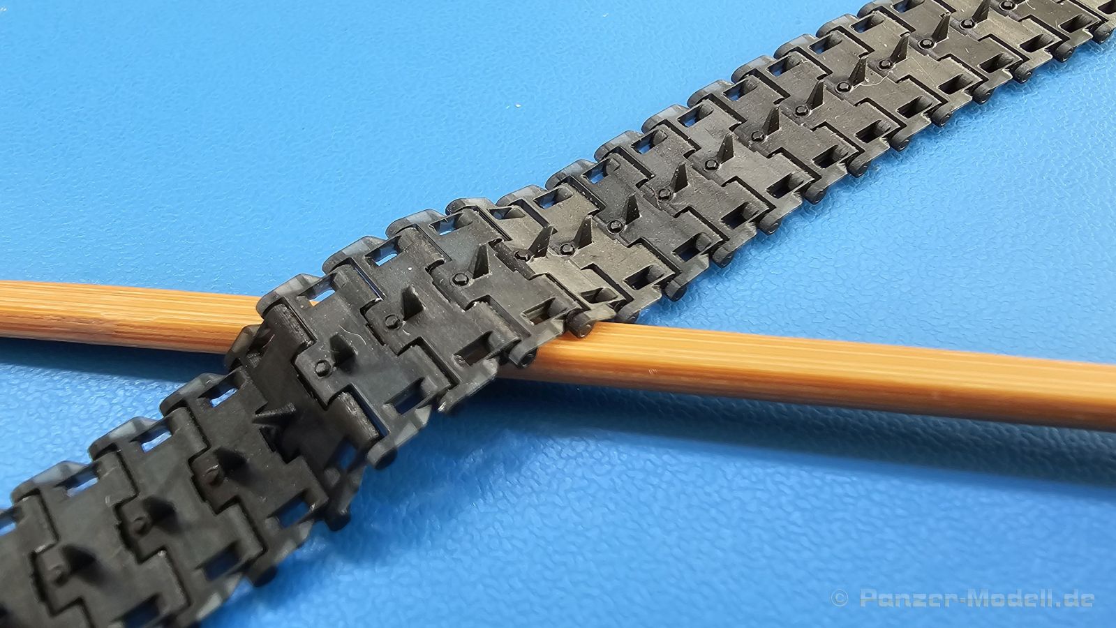 Tracks for: Light Tank M24 Chaffee Type T72 Der M24 Chaffee war ein U.S. amerikanischer Aufklärungspanzer, der ab Dezember 1944 zum Einsatz kam und mit Modifikationen in verschiedenen Ländern bis in die 1990-er Jahre seinen Dienst tat. Für die M24 im 2. Weltkrieg bringt uns QuickTracks 3D-gedruckte T72 Stahlketten. Der Karton ist 100 x 75 x 30 mm groß, die Rückseite mit Langloch zum Aufhängen des Kartons in einen Verkaufsständer ca. 130 mm lang. Auf der Rückseite befinden sich Fotos, wie man die Ketten zusammenbauen kann (mit Pinzette!). In zwei wiederverschließbaren Plastiktüten befinden sich 165 Einzelglieder und Ersatzglieder und Draht. Der Druck ist sehr gut - sauber, detailliert und fehlerfrei. Es gibt mit bloßem Auge keine sichtbaren Drucklamellen, sondern nur feine, glatte Flächen. Man sieht auch keine Reste der Druckstützstrukturen und kann also gleich mit dem Zusammenbau loslegen. Die Gussnummern in den Feldern sind vorhanden, wenn auch mit dem bloßen Auge schwer zu erkennen. Stege, Schrauben und Durchbrüche für Antriebszähne und sind gut und sauber ausgearbeitet. Es gibt zusätzliche Glieder, die durchgehende Bohrungen für die Kettenbolzen haben und scheinbar als Ersatzkettenglieder gedacht sind. Es gibt ein kurzes Stück Draht zur Darstellung der Bolzen, mit dem man diese Glieder verbinden kann. Der Zusammenbau ist einfach. Von der auf der Packung angegebenen Anleitung, die Glieder mittels Pinzette zusammenzusetzen, halte ich nicht viel. Auch wenn die Glieder klein sind, geht es mit den Fingern meiner Meinung nach am einfachsten. Man setzt ein Glied an einer am nächsten Glied an und klickt sie dann zusammen. Die Kette bleibt voll beweglich, trotzdem hält sie gut zusammen, dass sie auch leichten Zug aushält. Ich konnte innerhalb kürzester Zeit beide Kettenstränge zusammensetzen. Ein 1-minütiges Video des Herstellers zeigt, wie man die Ketten von Hand zusammensetzen kann. Sie sehen nicht nur gut aus, sondern sind auch sehr leicht zusammenzusetzen und bleiben zudem voll beweglich. Der Preis um die 30 Euro für 3D-gedruckte Kette ist heutzutage im normalen Bereich. Meine ersten Quicktracks und ich muss sagen, dass ich begeistert bin und sie mit gutem Gewissen auch für Anfänger weiterempfehlen kann.