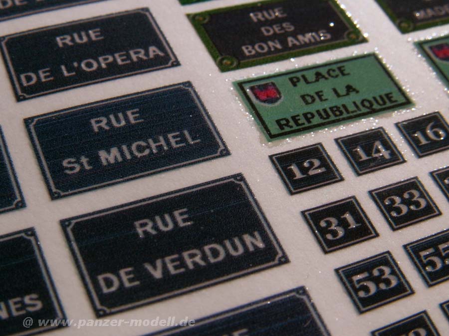 Zum einen umfasst es schöne alte französische Straßenschilder mit Straßennamen in verschiedenen Versionen und zum anderen vor allem auch entsprechende Hausnummern - der Hauptvorteil hier liegt aber, dass der optische Eindruck echter Emailleschilder wieder gegeben wird. Diese sind leicht erhaben und in einer speziellen prozedur gedruckt um diesen Effekt zu erzielen.