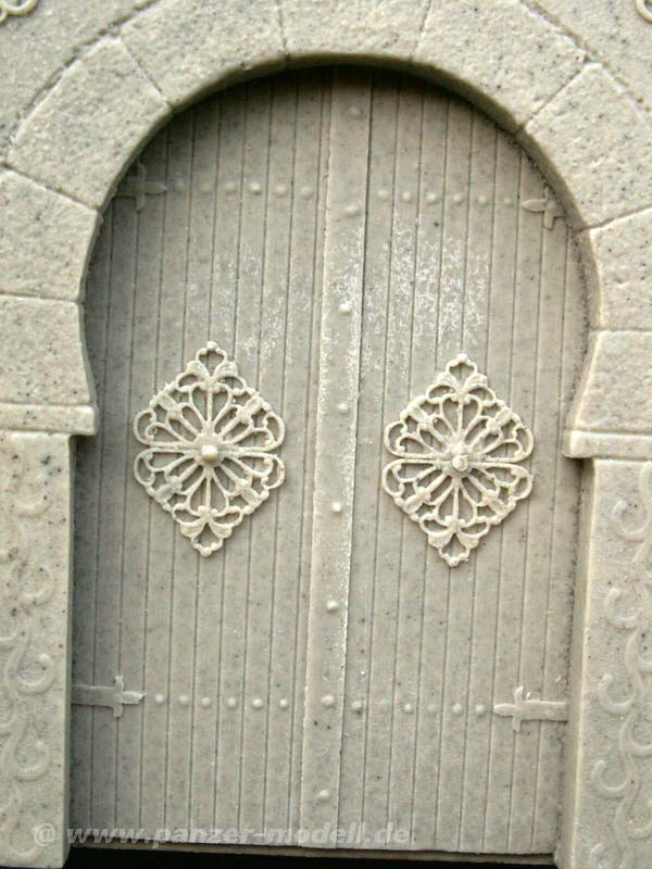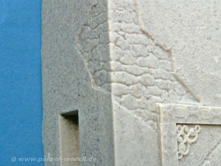 Der Guss der mächtigen Teile ist exzellent mit tollen Details. Allein die Eingangstür ist ein Augenschmaus. Auch die Wand mit ihrer Putzstruktur, bzw. den Beschädigungen und dem darunterliegenden Gemäuer.