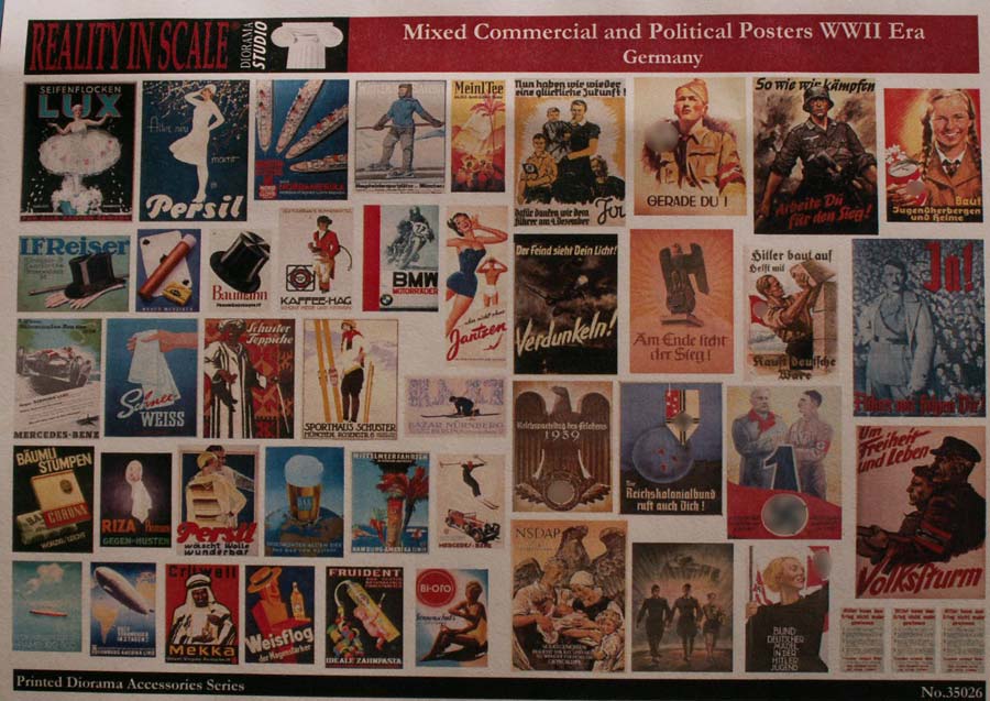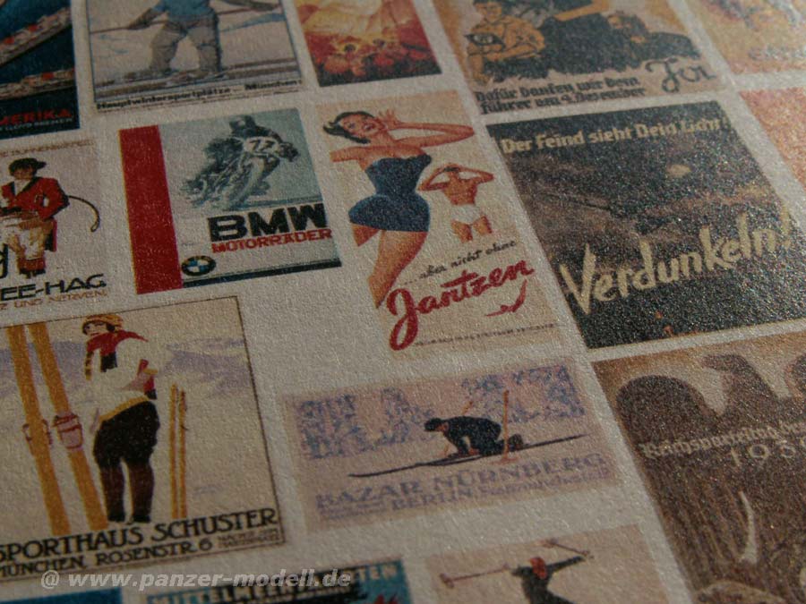 Die Auswahl ist dabei exzellent mit Werbebildern verschiedener Produkte und Propagandamaterial mit teilweise bekannten aber auch seltenen postern. Es sei angemerkt, dass hier auch (hierzulande) verbotene Abzeichen drauf zu sehen sind - aber wer eh nur für sich baut und das nicht öffentlich zeigt, bekommt hier ein paar interessante Gestaltungsmöglichkeiten.