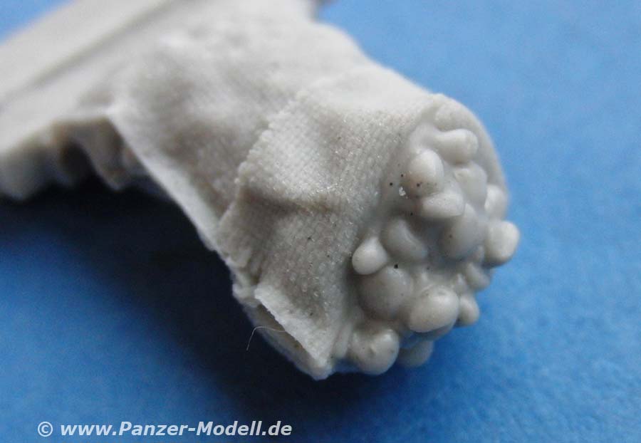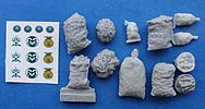 Die Resinteile sind bereits komplett gegossene, verschieden große Säcke, die teils geschlossen, teils offen dargestellt sind. Bei den offenen, kann man die enthaltenen Kartoffeln sehen, aber auch bei den geschlossenen sind die markanten Beulen von Kartoffeln zu erkennen.