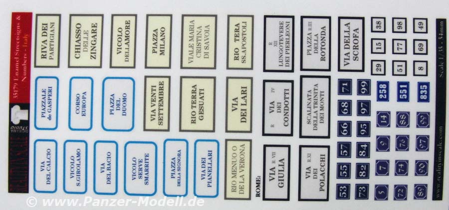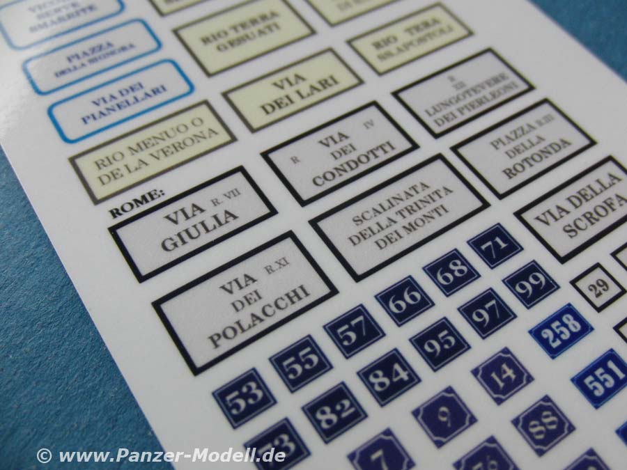 In diesem Set finden sich ein gedruckter Bogen mit aufgedruckten Straßennamen und Hausnummern aus Italien.