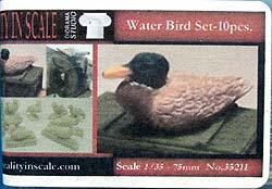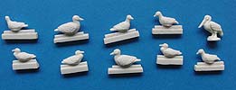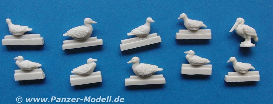 Das Set beinhaltet 10 Figuren von Wasservögeln. Die Darstellung dieser ist gelungen - die Andeutung der federn und der Köpfe und Flügel ist recht gelungen. Welche Vogelarten es nun einzeln sein sollen, entzieht sich meiner Kenntnis - diejenigen, die offenbar Enten darstellen sollen, finde ich persönlich etwas zu groß geraten.